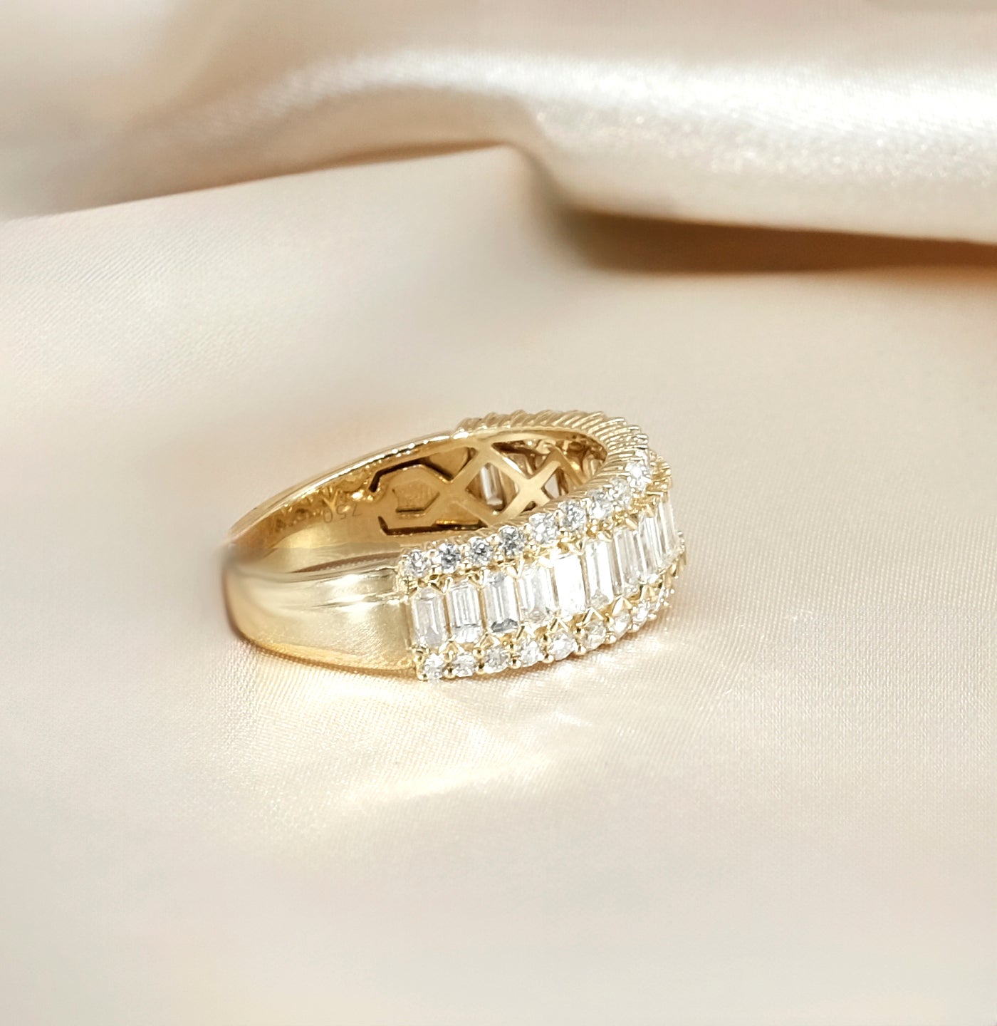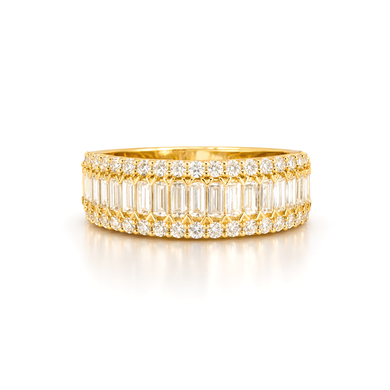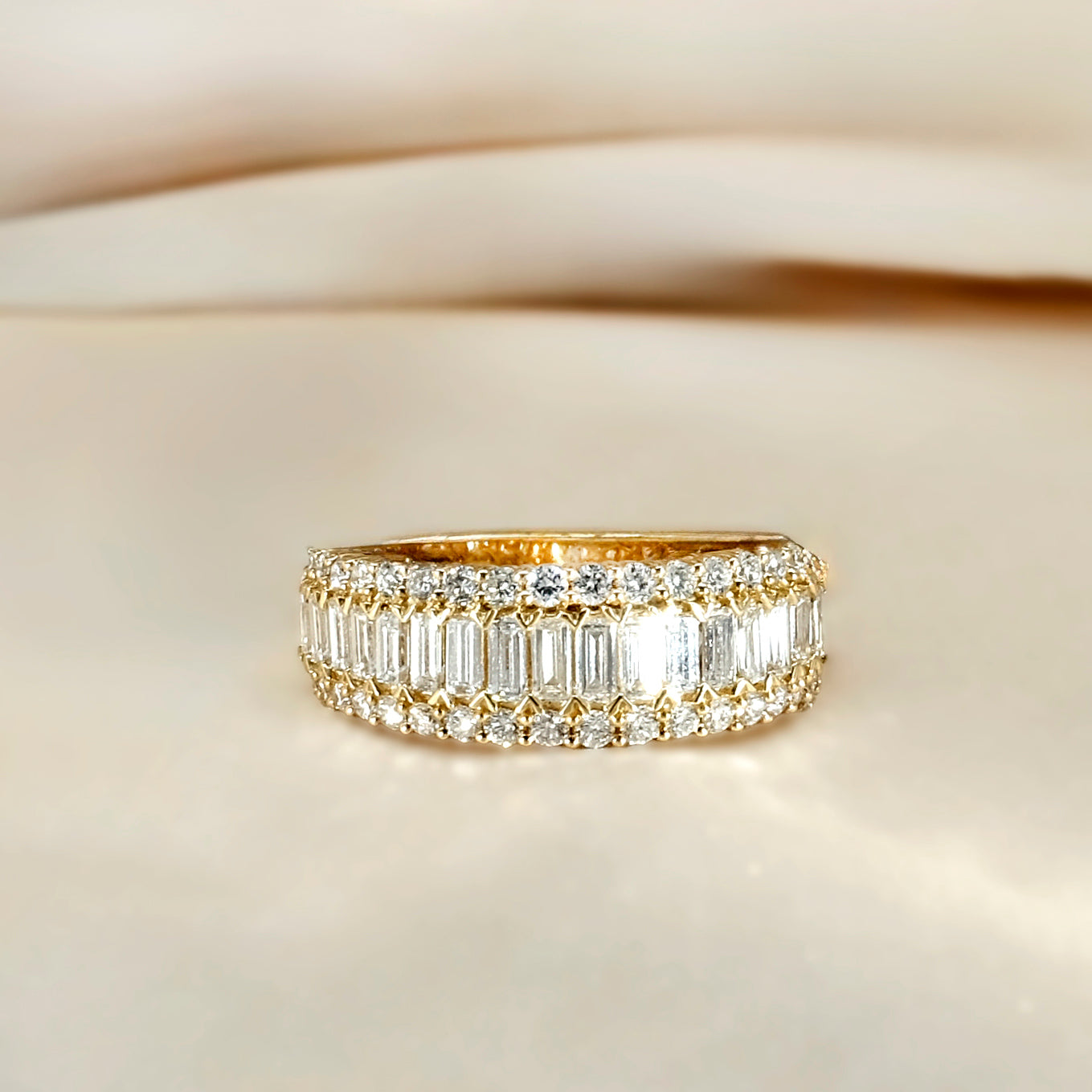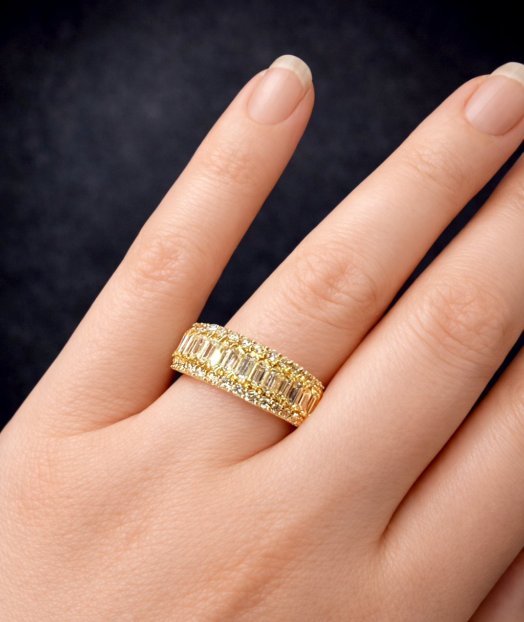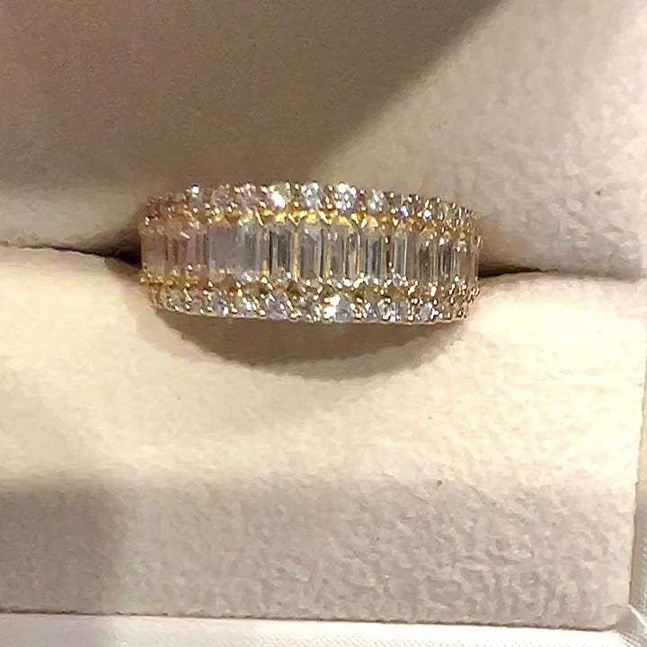 A striking expression of modern luxury, this exquisite eternity ring showcases 1.33 carats of lab-grown diamonds, meticulously set in rich 18K yellow gold. At its centre, a seamless row of baguette-cut diamonds creates a clean, architectural silhouette, celebrated for its refined brilliance and contemporary appeal. Framing the centre row, round brilliant-cut diamonds are delicately pavé-set along both edges, adding layers of sparkle and depth from every angle. Each diamond is hand-selected for its exceptional F colour and VS2 clarity, ensuring outstanding fire, brilliance, and a bright white appearance.