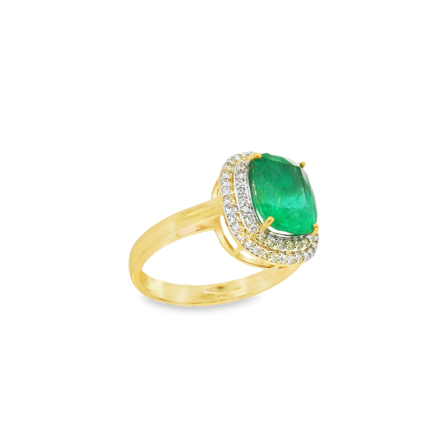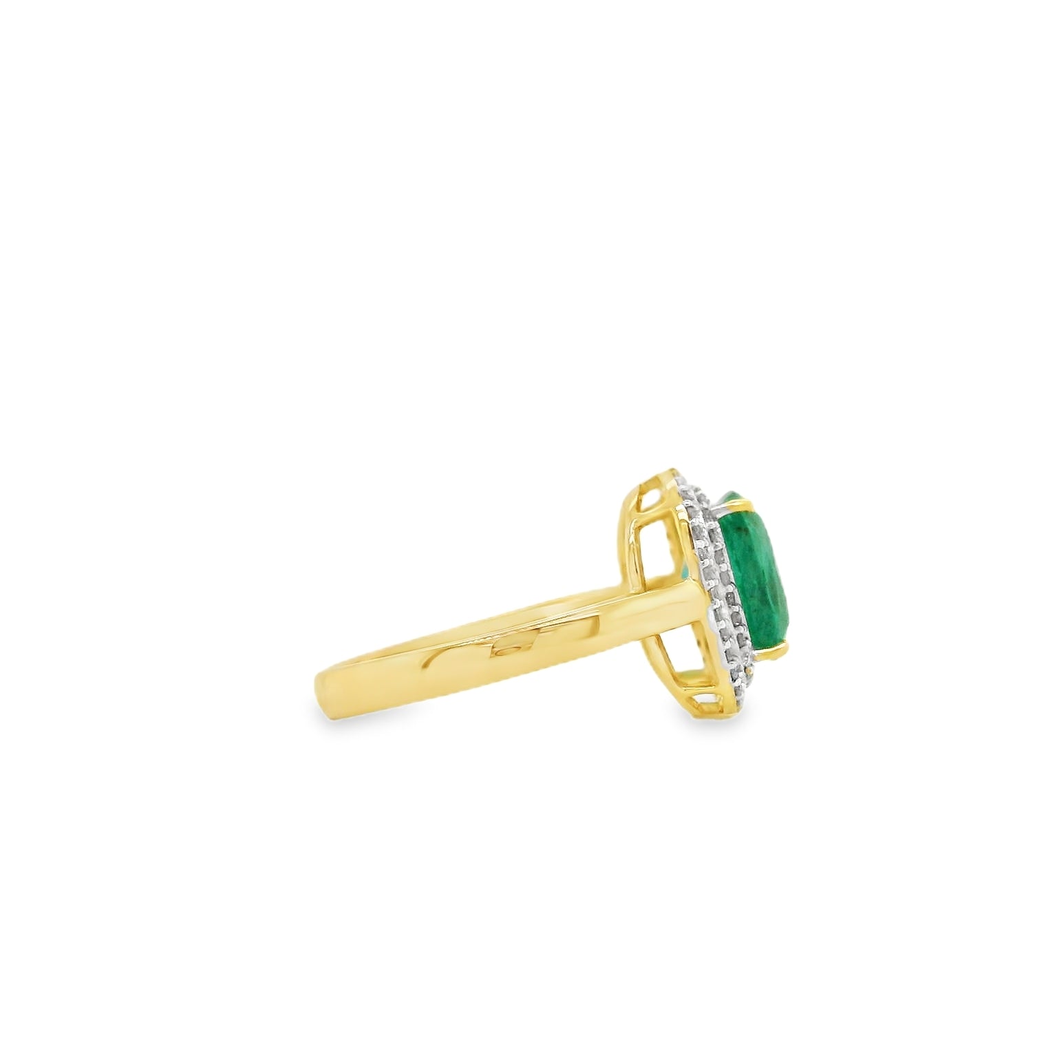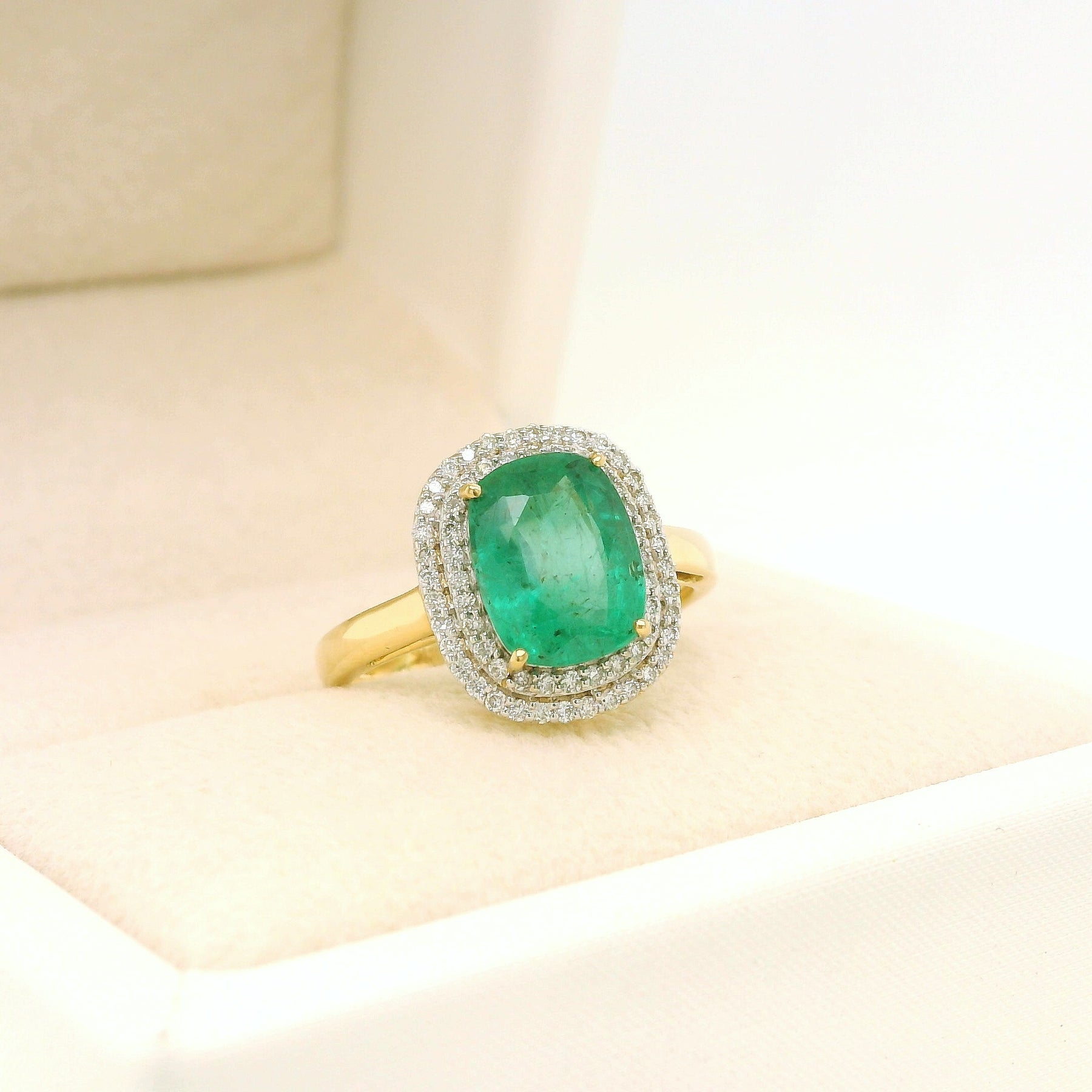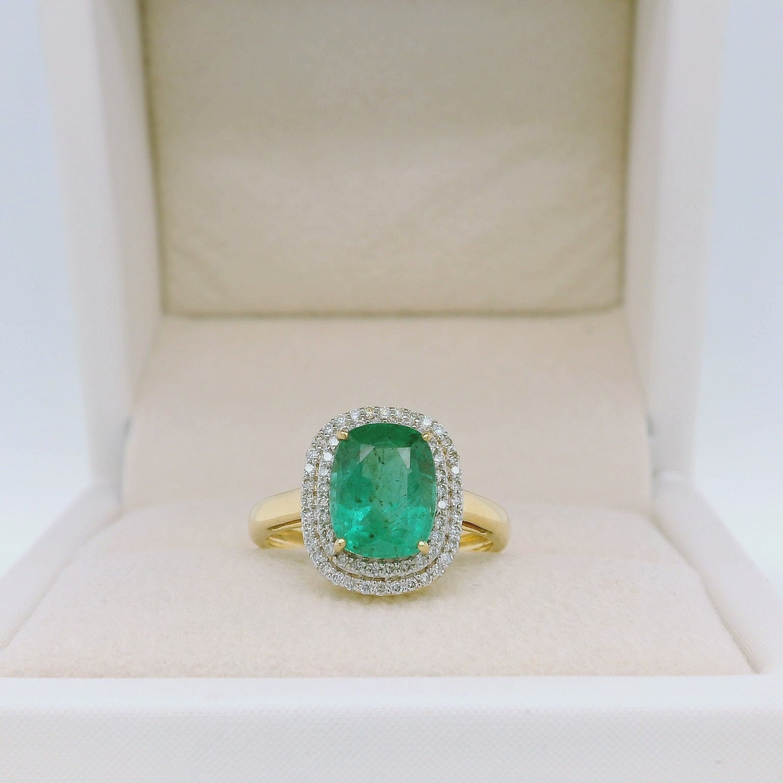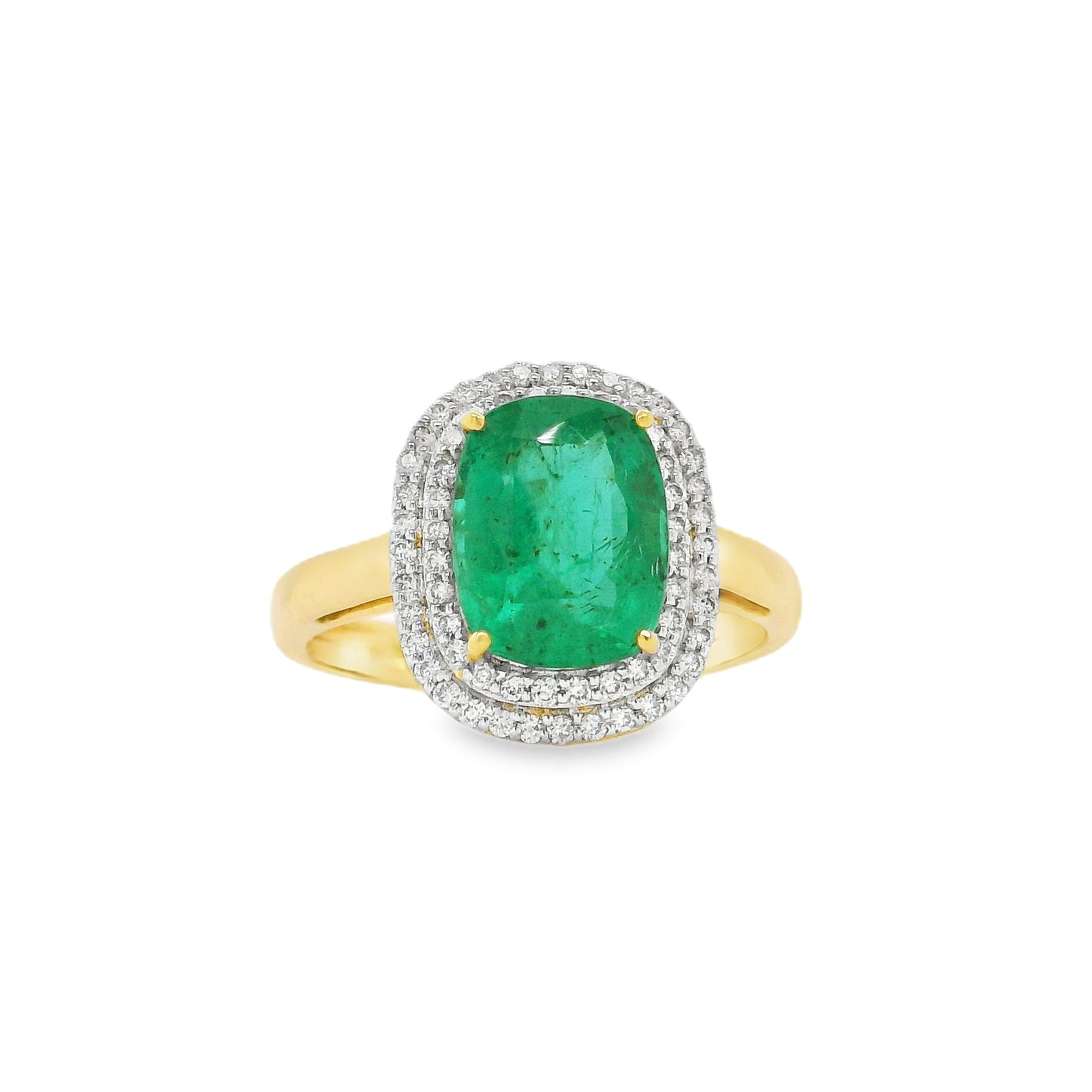 Crafted in rich 18K yellow gold, this elegant ring features a striking 2.13ct natural emerald in an elongated cushion cut, combining soft curves with refined structure. The centre stone is enhanced by a double halo of natural diamonds totalling 0.25ct, adding layered brilliance and depth while keeping the emerald as the focal point. Refined yet eye-catching, this piece is a timeless statement of colour and classic luxury.