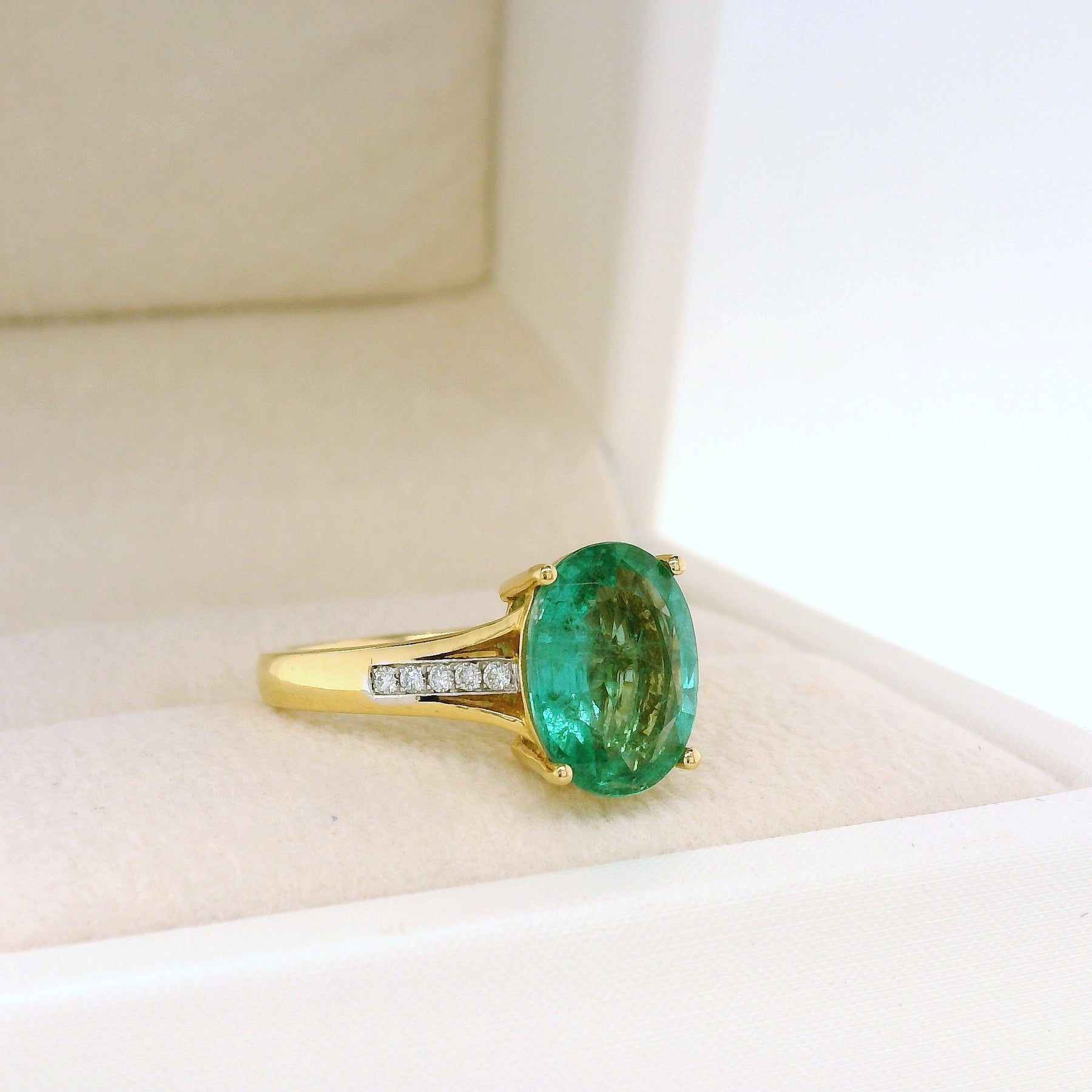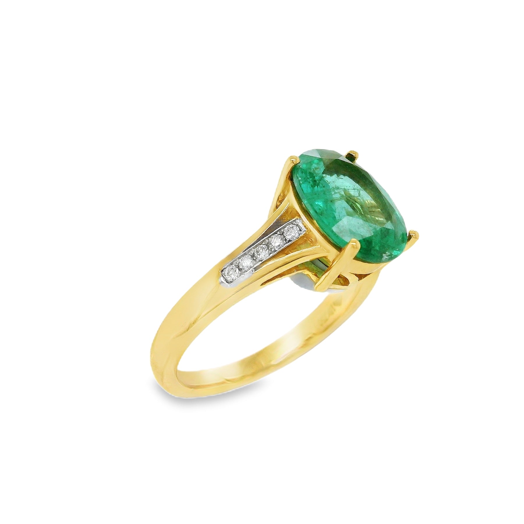 Crafted in warm 18K yellow gold, this refined ring showcases a vibrant 2.50ct natural oval-cut emerald, prized for its rich green colour and elegant shape. Subtle diamond accents set along the shoulders, totalling 0.10ct, add a touch of brilliance while keeping the focus firmly on the emerald. Balanced and timeless, this piece is designed for those who appreciate classic colour and understated luxury.