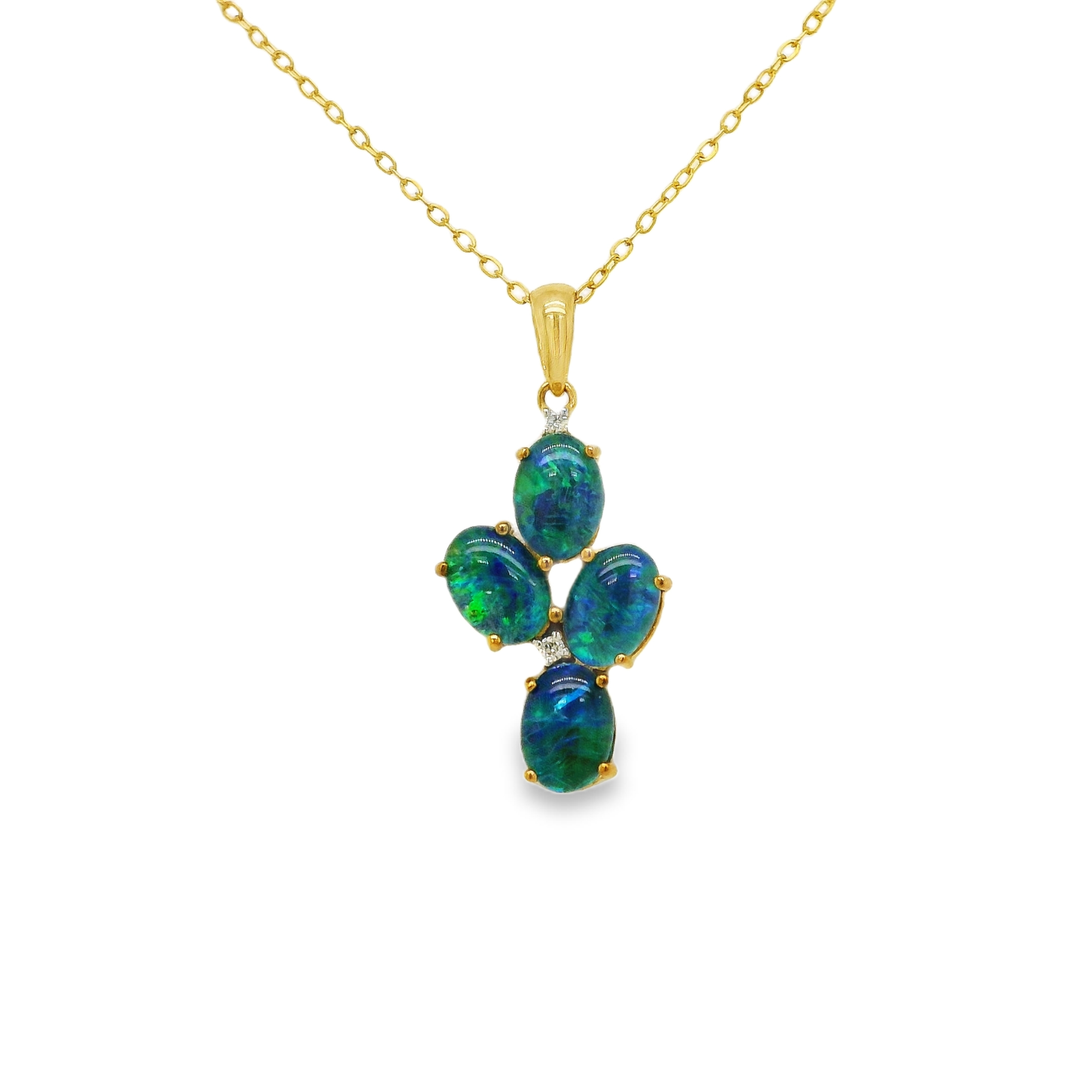 This polished gold pendant features a harmonious cluster of four oval opal triplets, each revealing subtle bluish-green hues through their protective triplet layering. The cabochon cuts enhance the opals’ gentle play of colour, offering a composed yet distinctive expression of Australian opal craftsmanship.