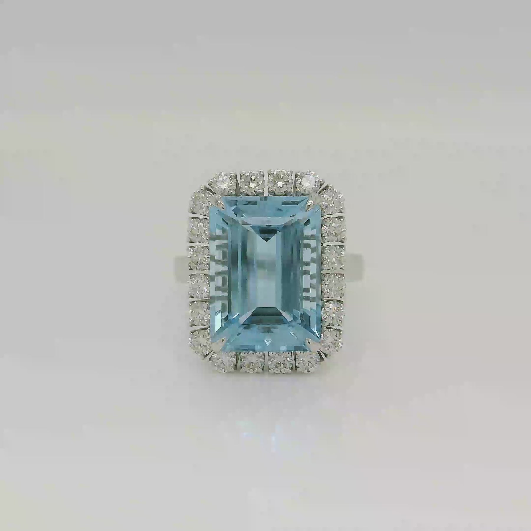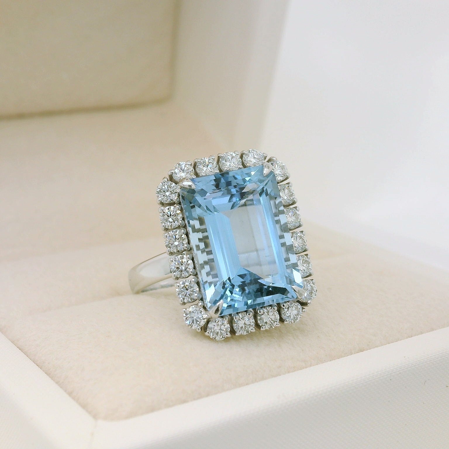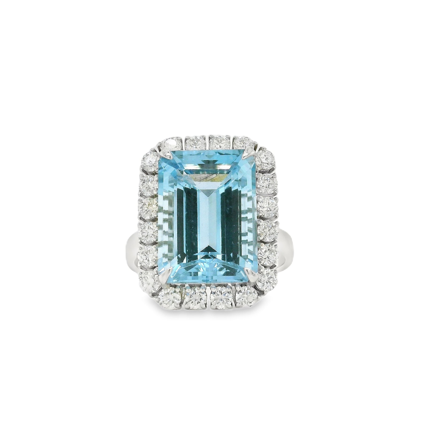 Crafted in luminous 18K white gold, this striking ring showcases a bold 7.12ct emerald-cut aquamarine, celebrated for its crisp ocean-blue hue and elegant step-cut facets. The centre stone is elevated by a substantial halo of natural diamonds, totalling 0.89ct in exceptional F–G colour and VVS clarity, delivering intense brilliance and refined contrast. Sophisticated yet commanding, this piece is a standout design made for those who want colour, presence, and unmistakable luxury on the hand.