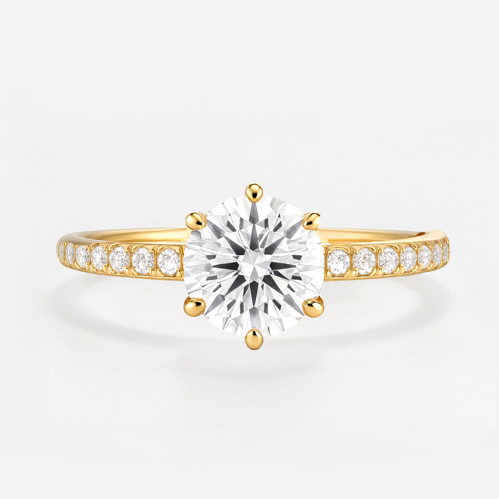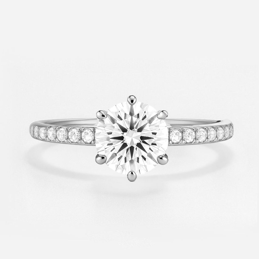 Introducing The Vivienne Ring, a refined and radiant engagement ring that effortlessly blends timeless elegance with modern craftsmanship. Featuring a classic six-claw setting, this design showcases a brilliant round diamond elevated by a graceful cathedral-style mount, allowing light to pass through and enhance the stone’s natural sparkle.