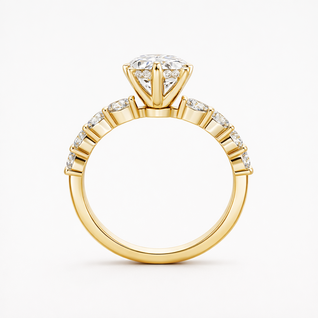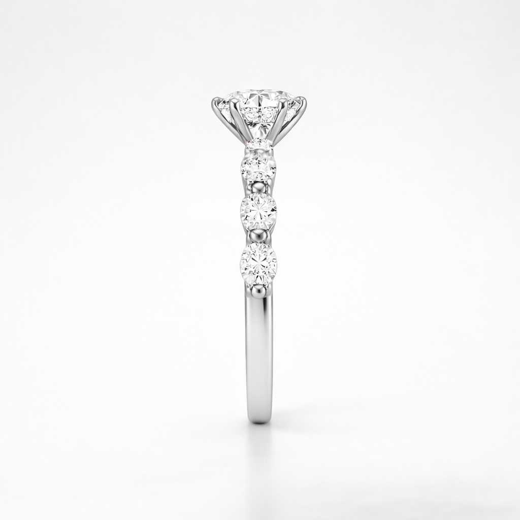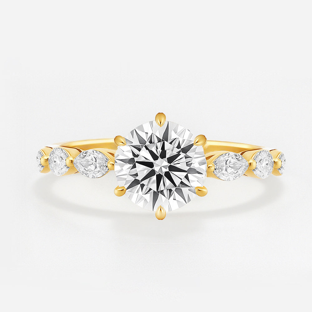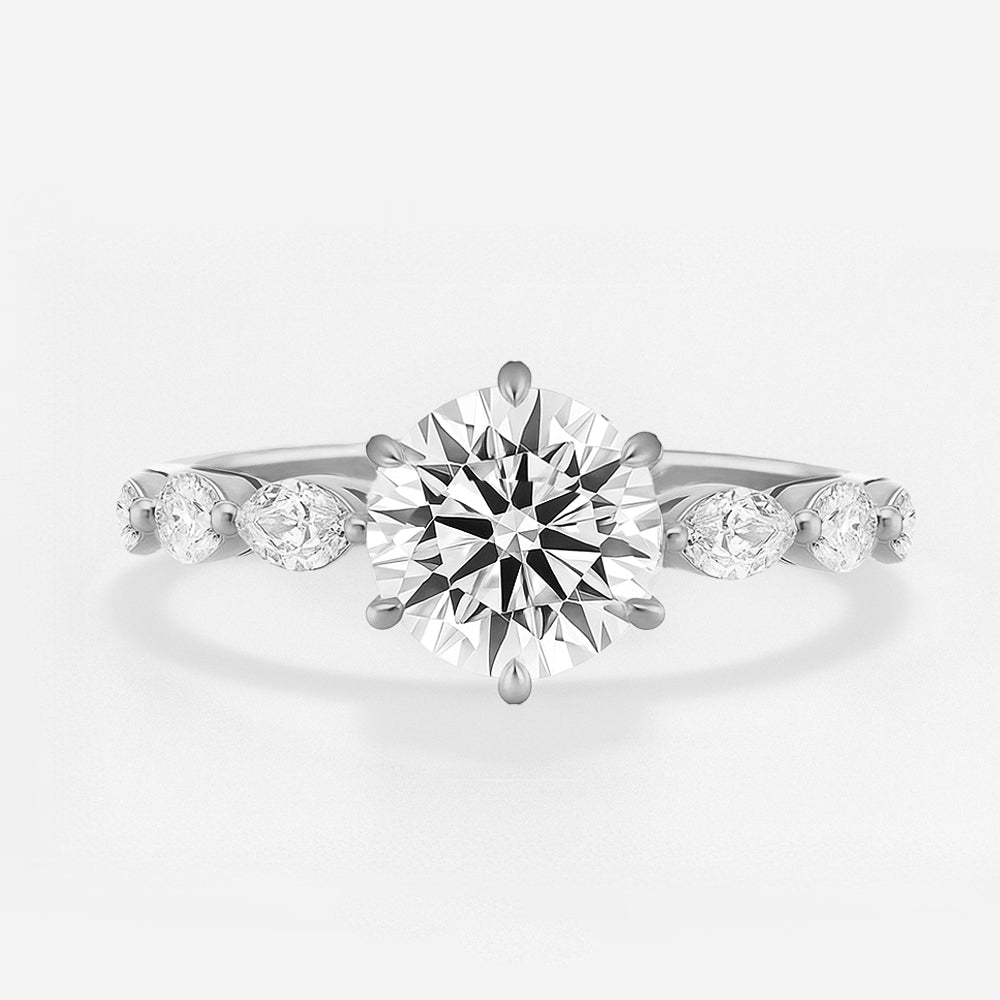 Presenting our Round Lab Grown Diamond Engagement Ring with a pave band, a graceful and sophisticated choice for your special moment. This ring features a stunning round lab-grown diamond at its centre and is adorned with marquise-cut accent stones. The sparkling pave band, crafted with lab-grown diamonds, enhances the ring's brilliance. Crafted with meticulous attention to detail, this ring is a perfect symbol of your love and commitment, blending classic charm with modern sophistication.