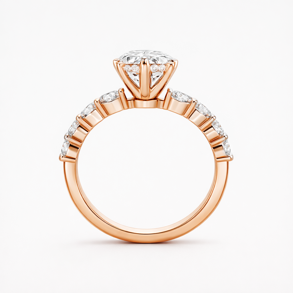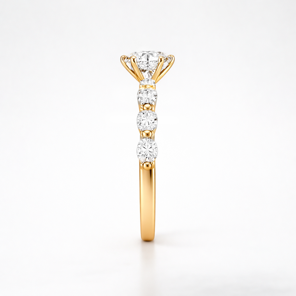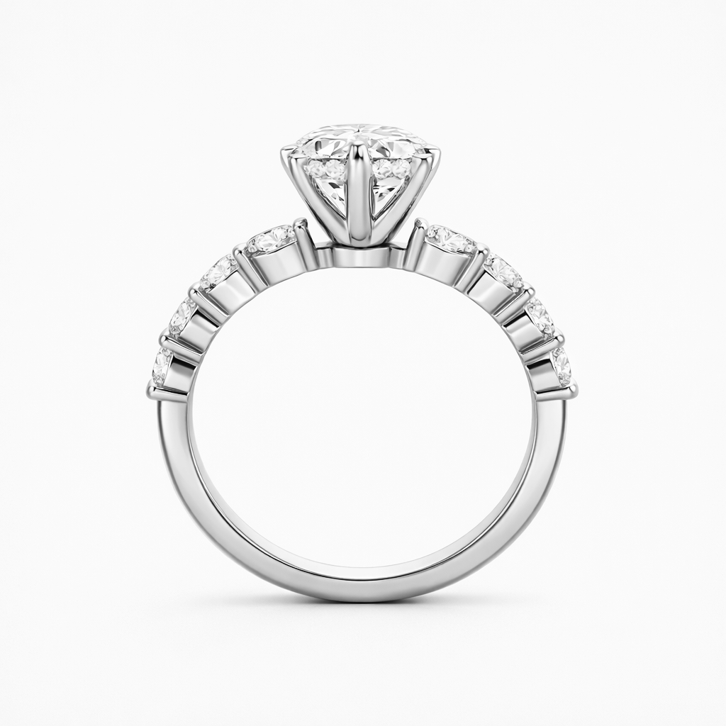 Presenting our Round Lab Grown Diamond Engagement Ring with a pave band, a graceful and sophisticated choice for your special moment. This ring features a stunning round lab-grown diamond at its centre and is adorned with marquise-cut accent stones. The sparkling pave band, crafted with lab-grown diamonds, enhances the ring's brilliance. Crafted with meticulous attention to detail, this ring is a perfect symbol of your love and commitment, blending classic charm with modern sophistication.