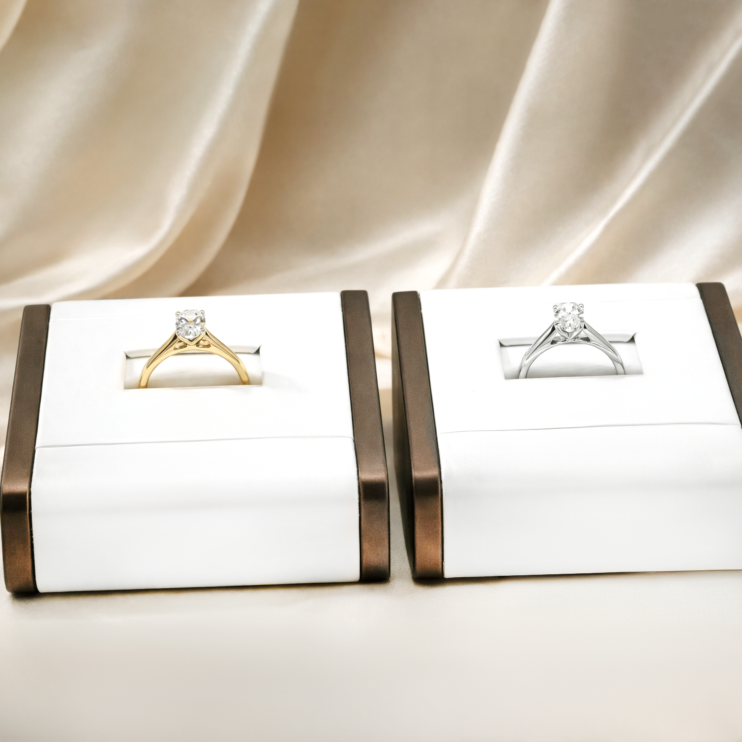 Our refined oval cathedral engagement ring features a 1.00ct oval lab-grown diamond, graded E–F/VS, set in luminous 14K white gold. The cathedral setting and softly contoured 2.5mm band enhance the diamond’s natural elegance, creating a timeless silhouette designed to be cherished for a lifetime.