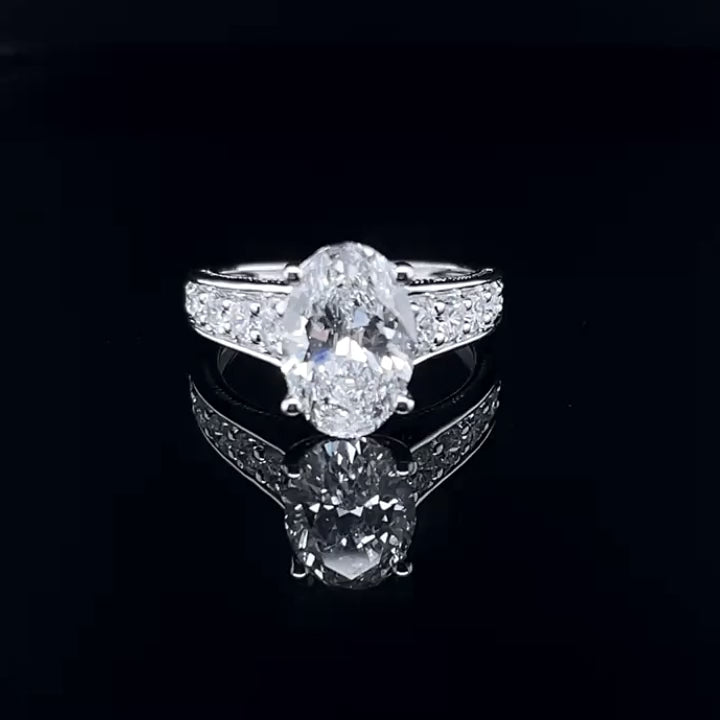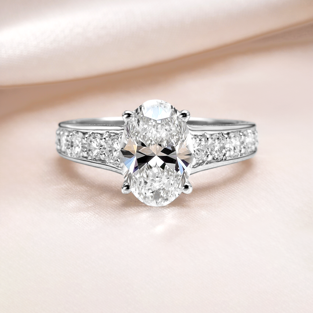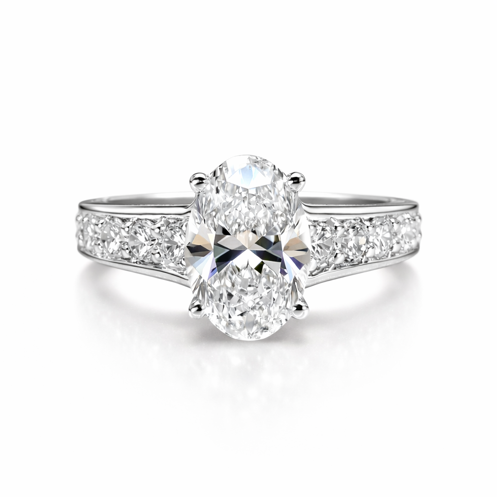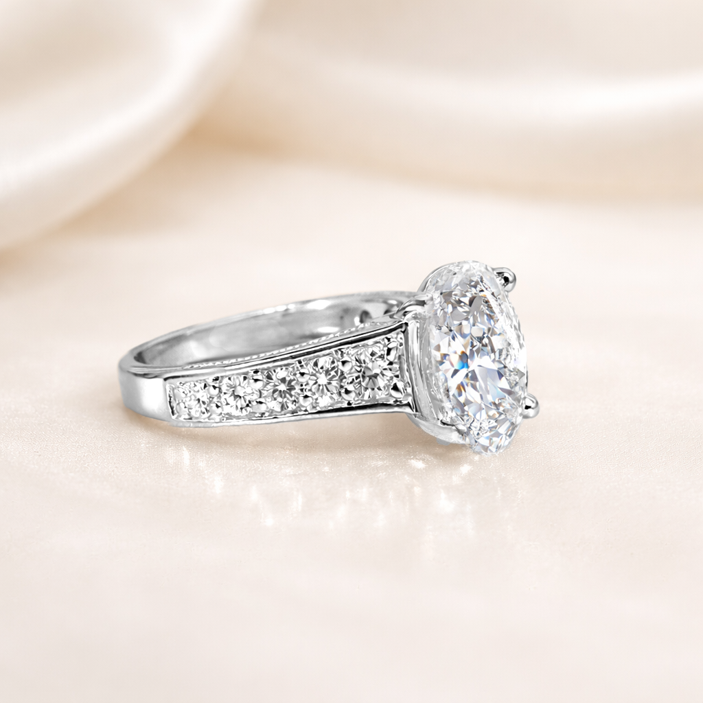 Our elegant oval engagement ring features a 3.00ct oval lab-grown diamond, graded E–F/VS, set in luminous 14K white gold. A tapered band with 0.75ct of channel-set lab-grown diamonds adds subtle brilliance and refinement, creating a balanced silhouette that feels both timeless and confidently modern.