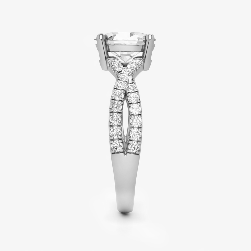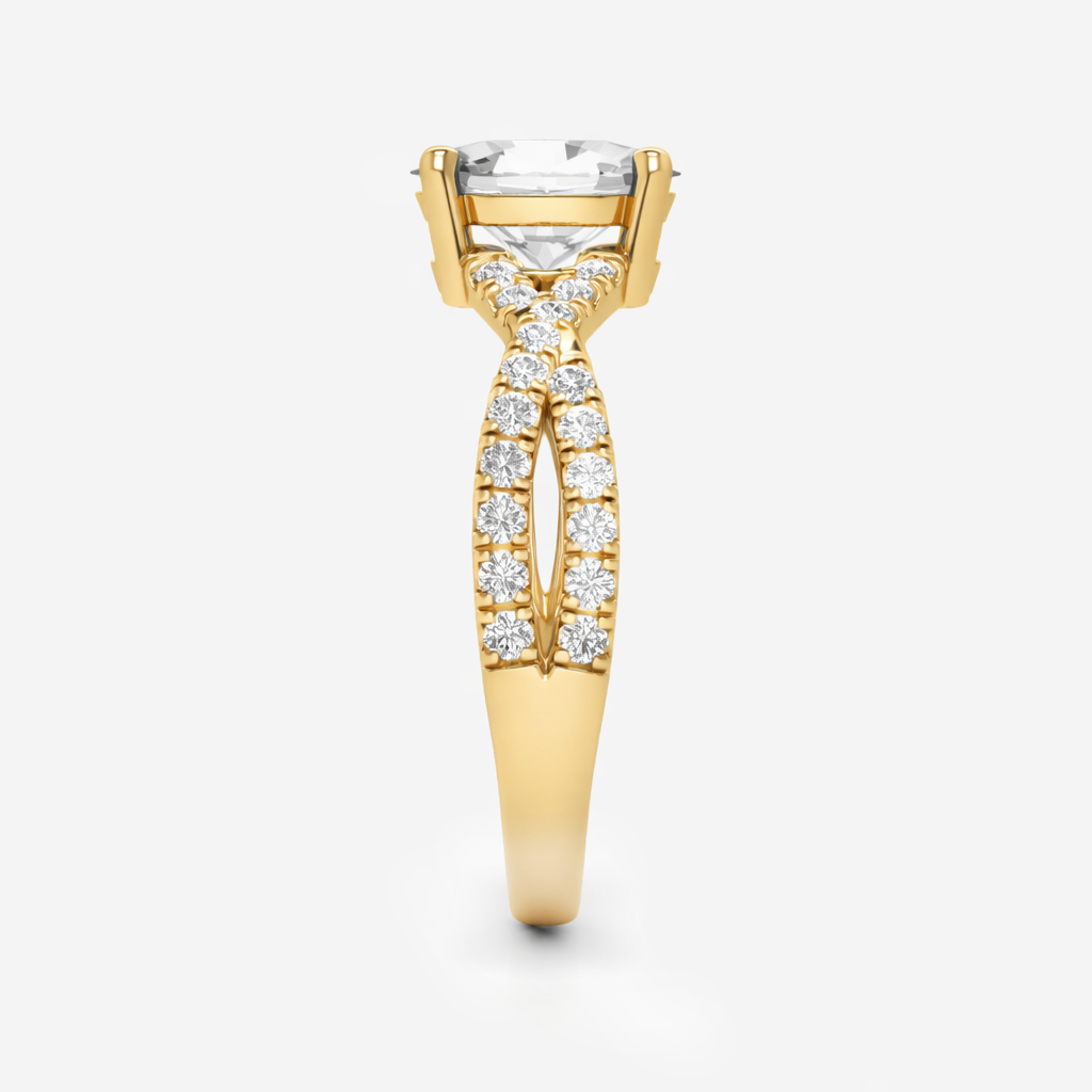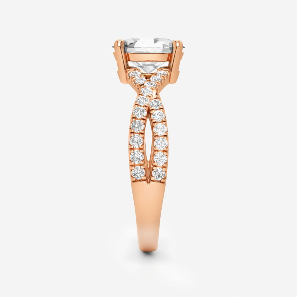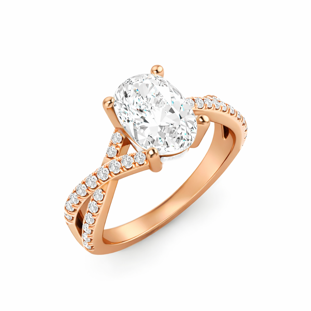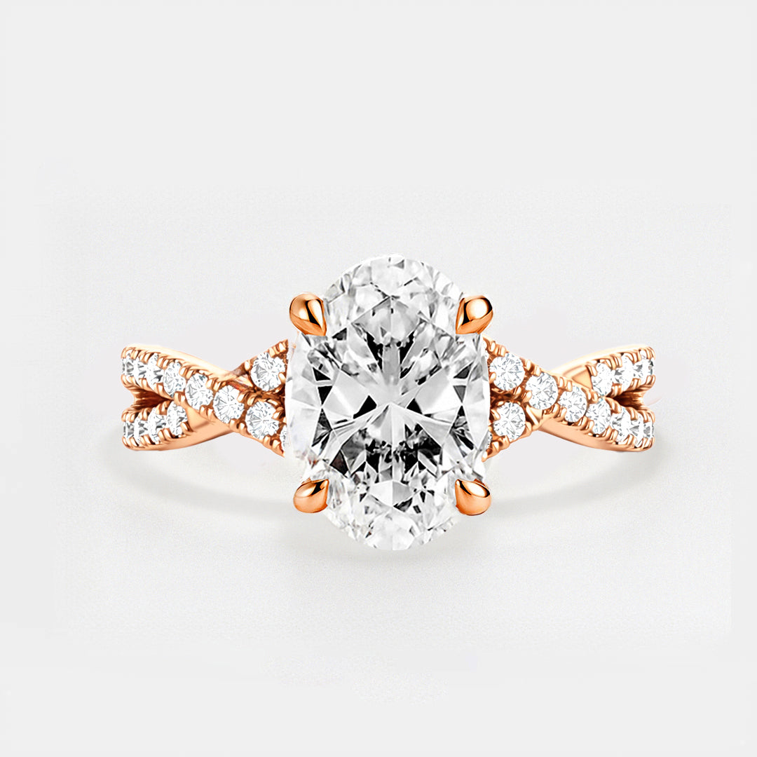 Elevate your engagement with this Oval Twist Engagement Ring, an embodiment of grace. This design features a captivating oval-cut diamond. The band itself twists delicately, leading up to the central stone and is adorned with a series of smaller diamonds that enhance the ring's overall brilliance. This ring beautifully combines the modernity of diamonds with classic aesthetics, making it an ideal symbol of a love that's both enduring and conscientious.