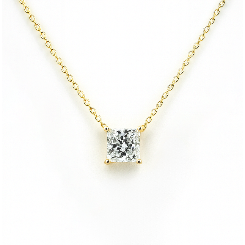 Elegant, timeless, and brilliantly crafted — this 10K Yellow Gold Lab Grown Diamond Necklace showcases a stunning 1.00ct princess-cut diamond in a classic four-prong setting.