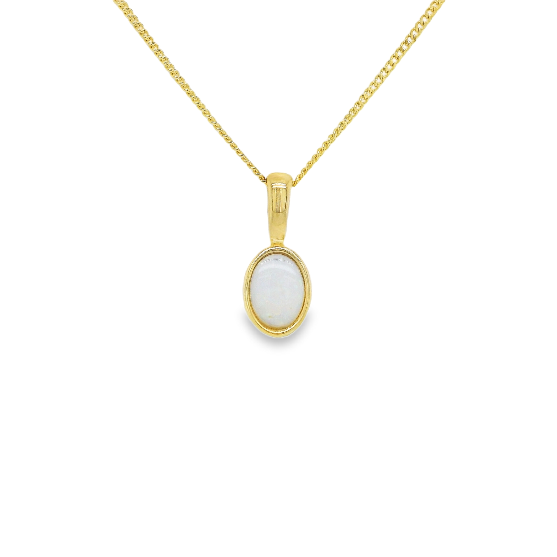 This yellow gold pendant features an oval cabochon-cut Australian white opal with a soft, luminous appearance and gentle flashes of colour. The opal is neatly bezel-set, allowing the natural character of the stone to remain the focal point while providing a clean, balanced finish. Refined in its proportions and understated in design, the pendant offers a timeless option suited to everyday wear.