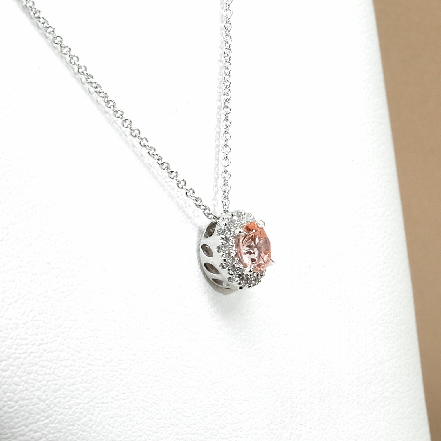 Delicate elegance meets modern brilliance in this refined 9K White Gold Lab-Grown Pink & White Diamond Necklace. At its centre, a captivating round lab-grown pink diamond radiates soft blush tones, beautifully framed by a sparkling halo of lab-grown white diamonds for added brilliance and contrast.