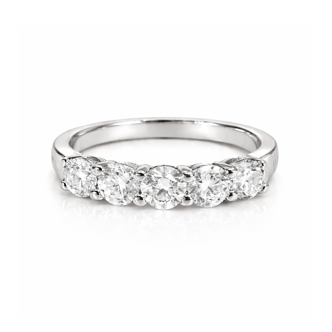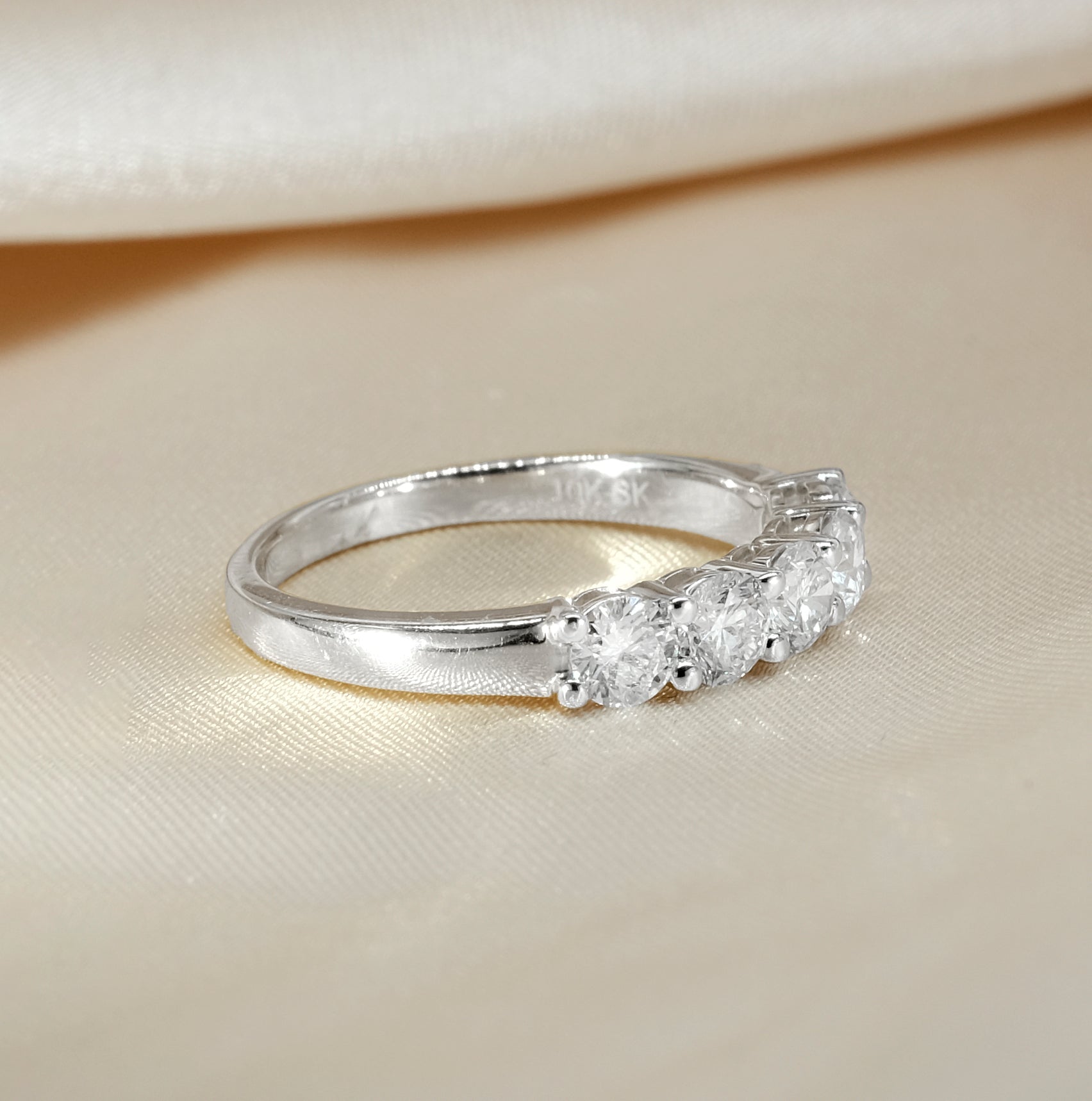 Timeless elegance meets modern sustainability in this classic five-stone diamond ring, beautifully crafted in polished 10K white gold. Featuring a total of 1.00 carat of lab-grown round brilliant diamonds, each stone is expertly set in a shared-prong design to maximise brilliance while creating a seamless, refined look across the finger.
