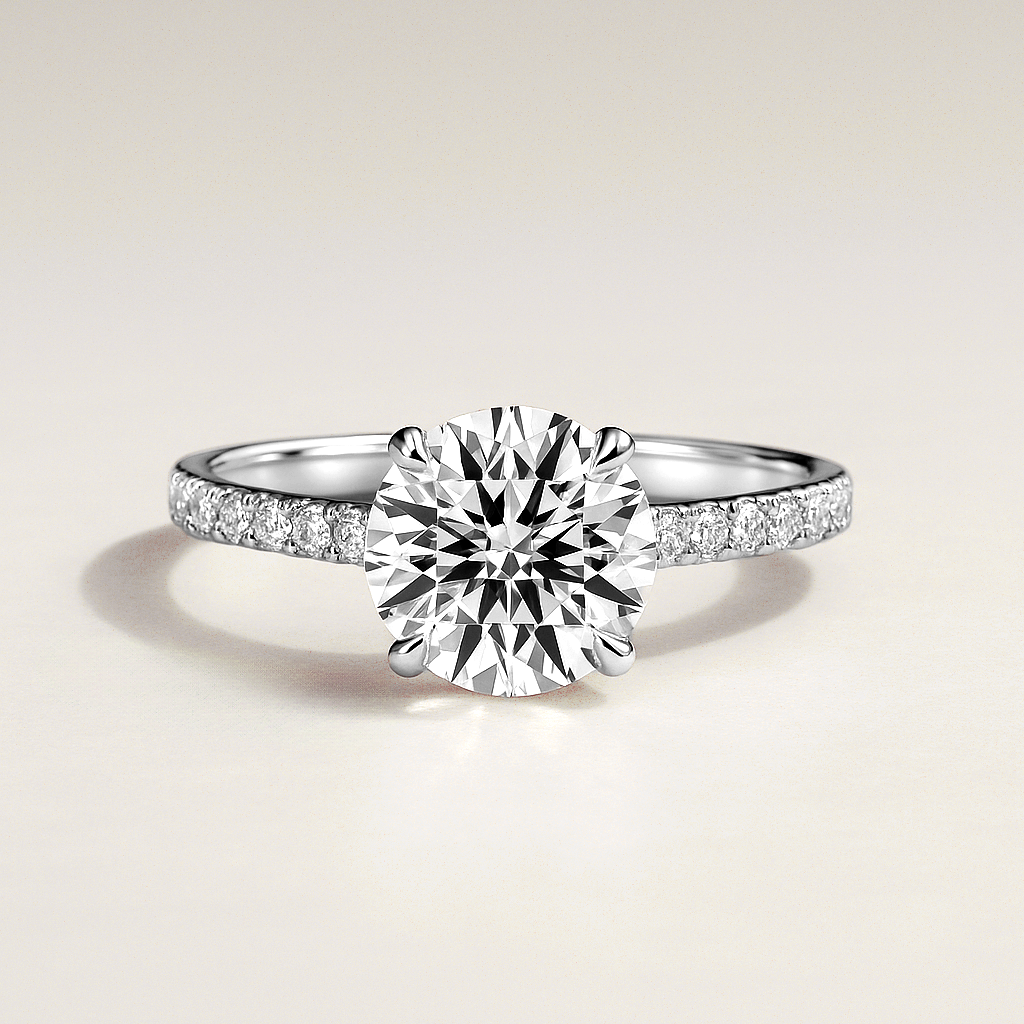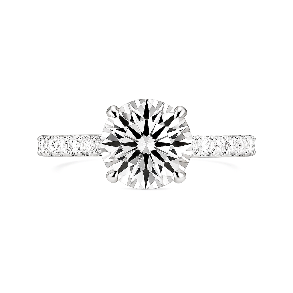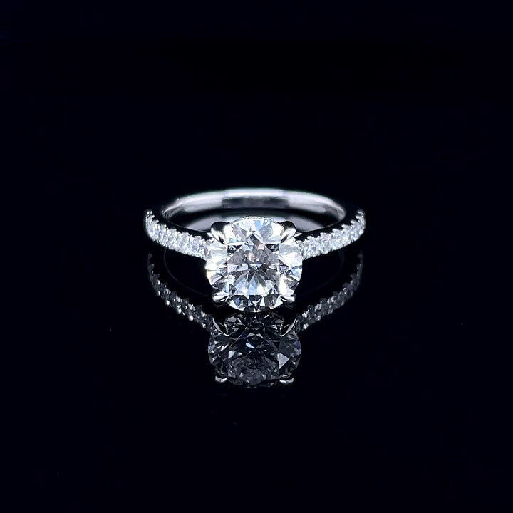 Timeless elegance meets refined detail in this exquisite 14K White Gold engagement ring. Showcasing a brilliant 2.30ct round cut lab grown diamond, the design highlights exceptional fire and symmetry, secured in a classic four-claw setting that allows maximum light to enhance its natural sparkle.