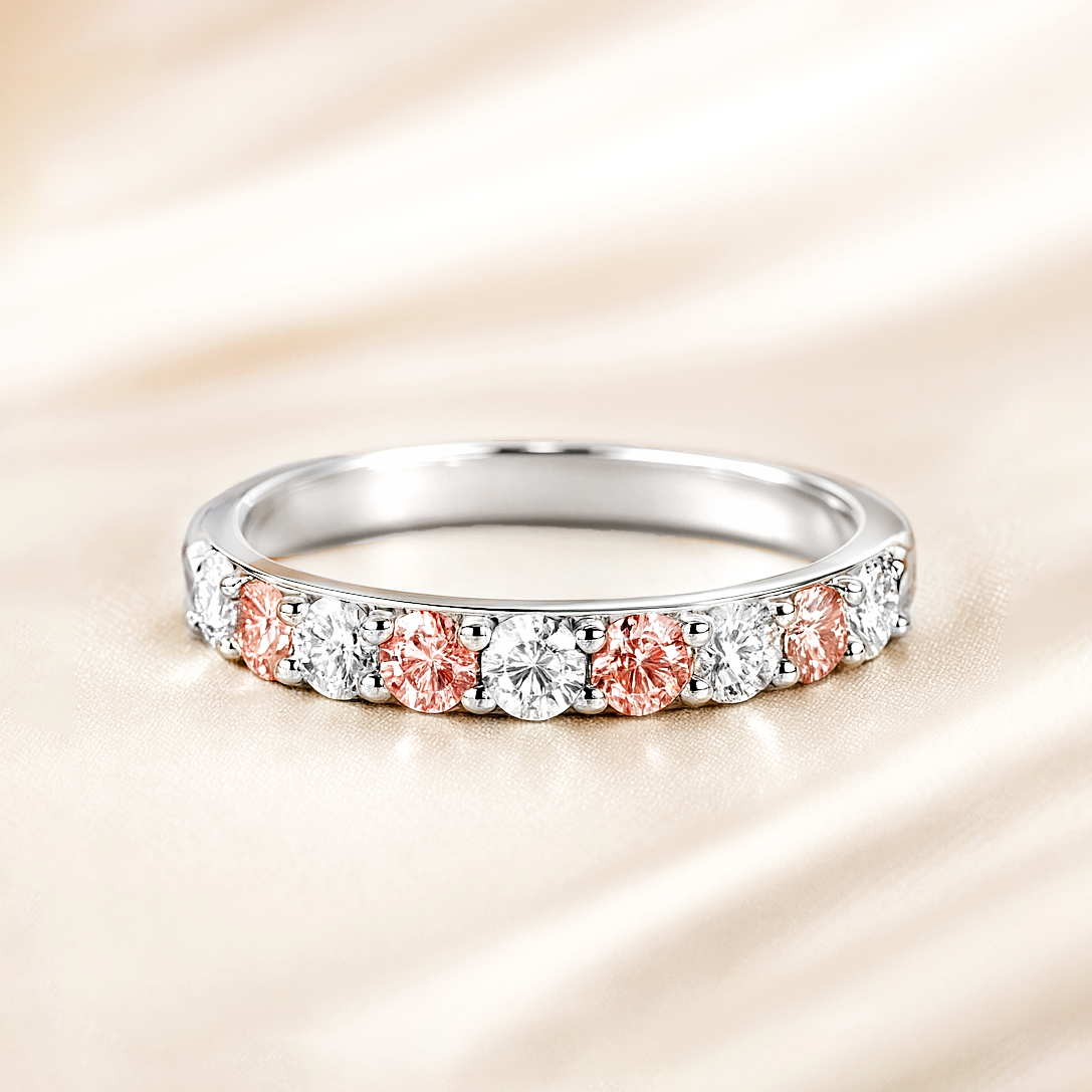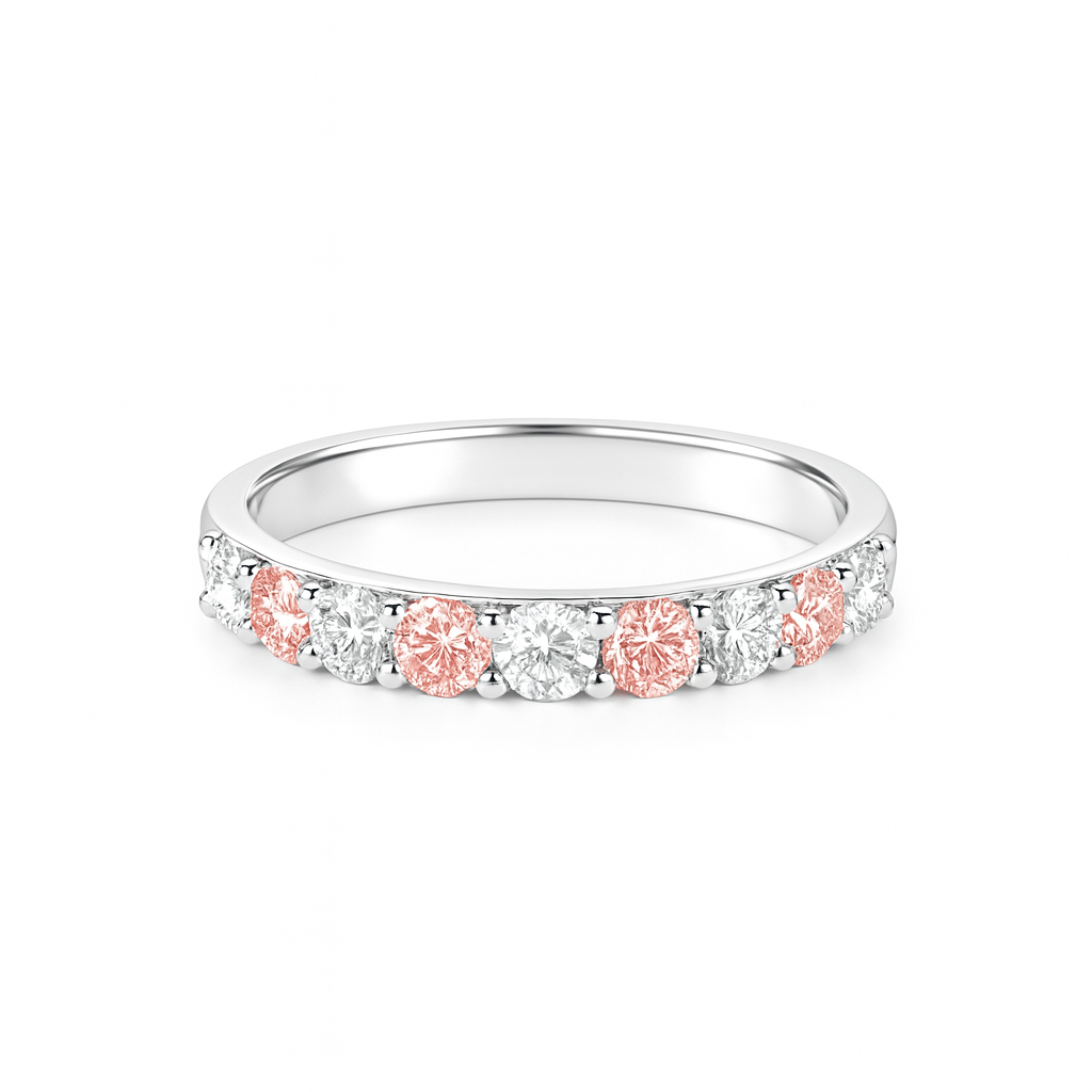 Elegant and modern, this 9K white gold band showcases 1.16ct of sparkling lab-grown diamonds in a soft alternating pattern of blush pink and brilliant white. Each round diamond is expertly prong-set to maximise light and brilliance, creating a delicate yet captivating look. Perfect for stacking, anniversaries, or as a unique stand-alone piece.