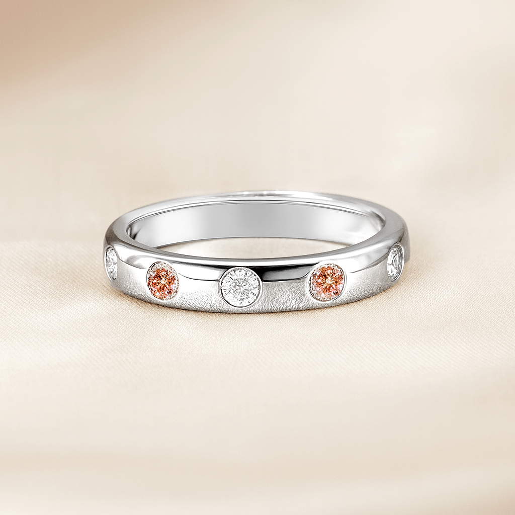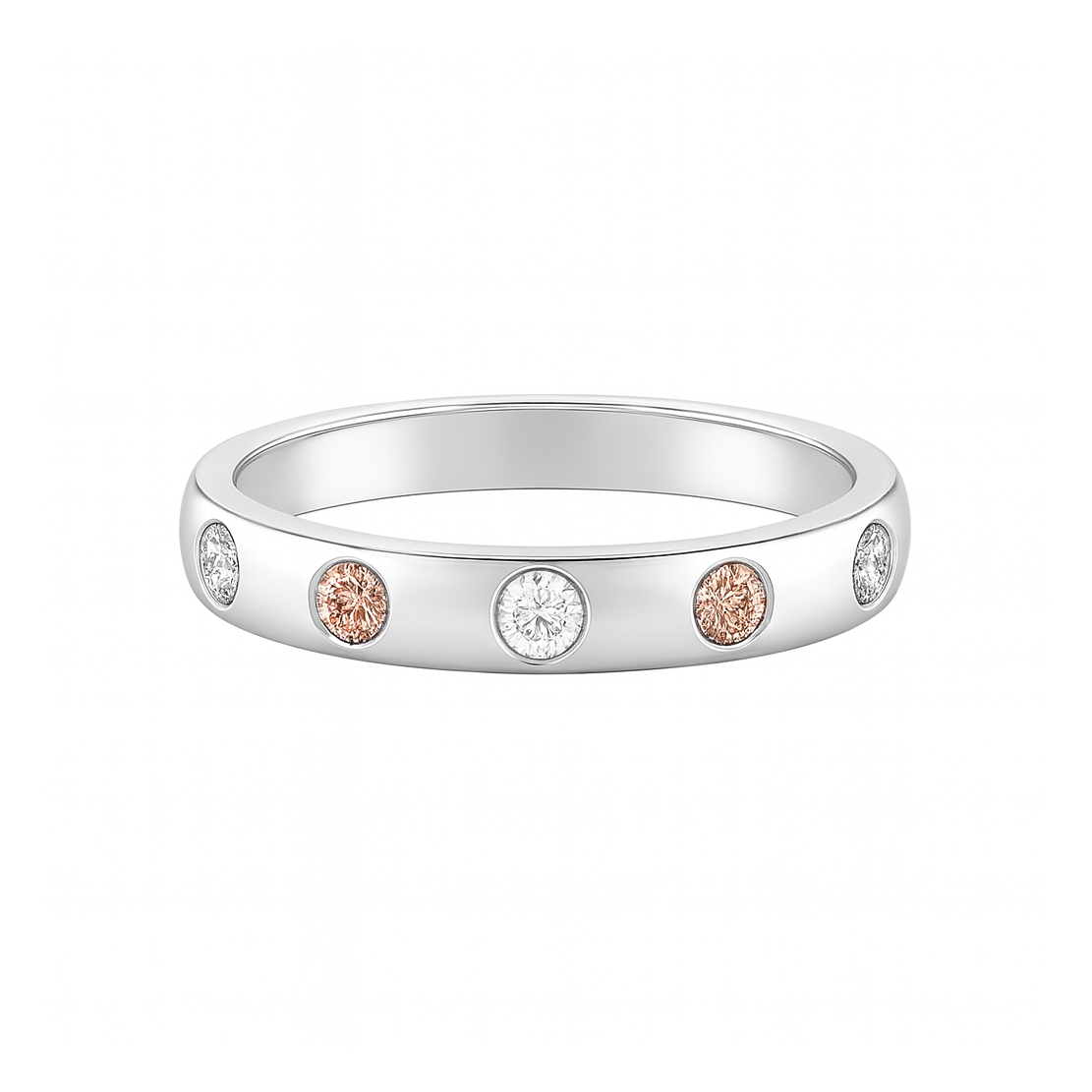 Modern elegance meets soft colour in this beautifully crafted 9K white gold ring. Featuring alternating round brilliant cut pink and white lab-grown diamonds, each stone is drop-set into the band for a sleek, smooth finish that feels both contemporary and refined. The subtle blush tones contrast delicately with the bright white diamonds, creating a graceful sparkle perfect for everyday wear or special occasions.