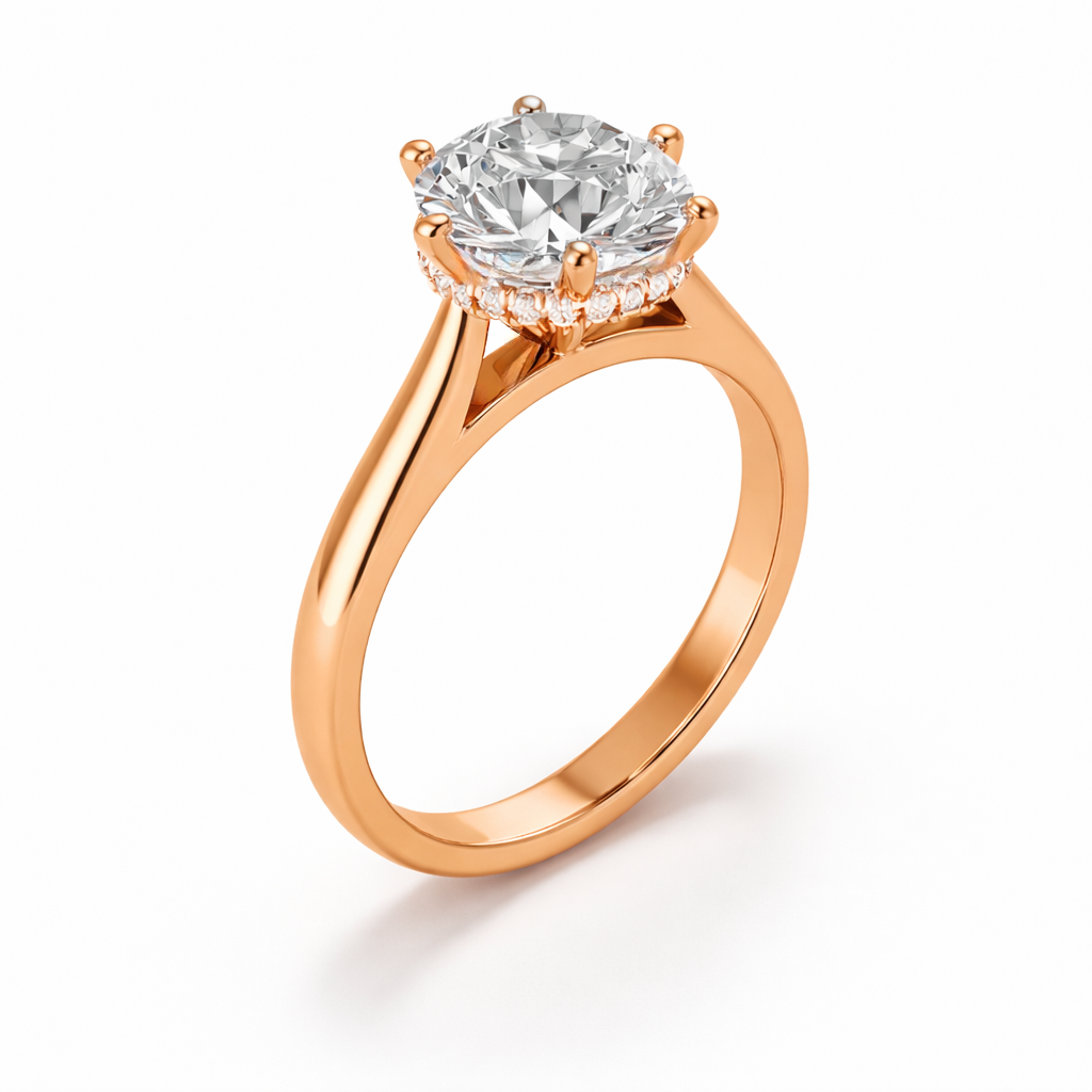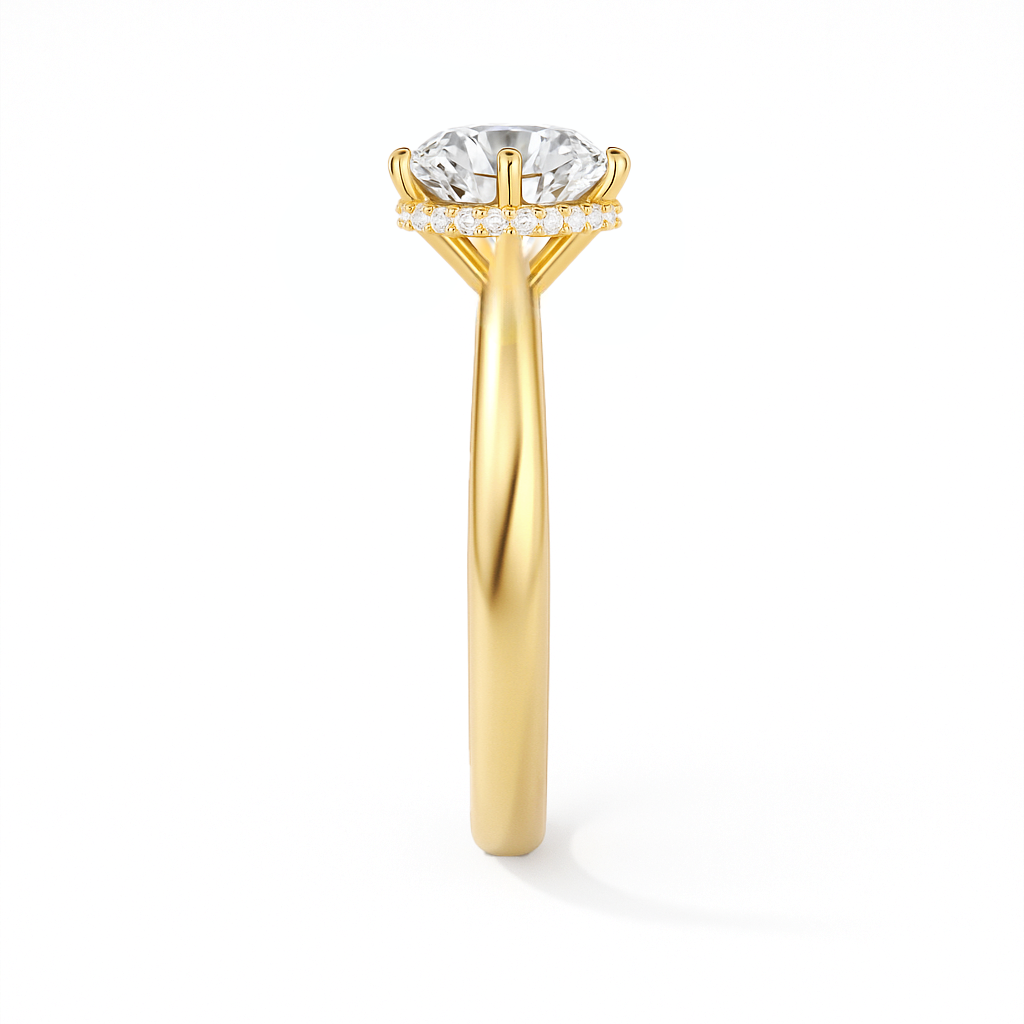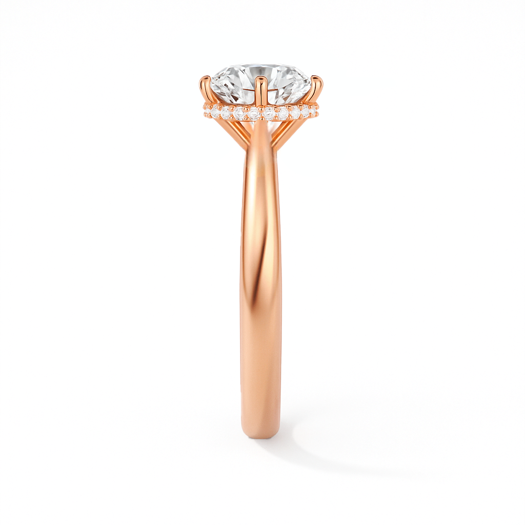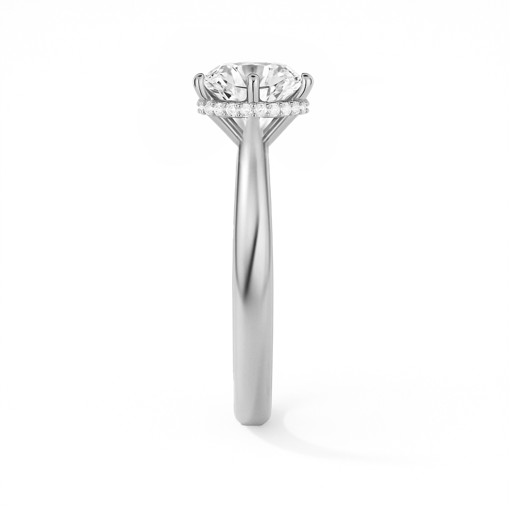 What makes The Clare truly special is its hidden halo — a delicate circle of diamonds tucked just beneath the centre stone, visible only from certain angles. This understated design element adds a surprise touch of brilliance and modern charm without disrupting the clean lines of the classic solitaire style.