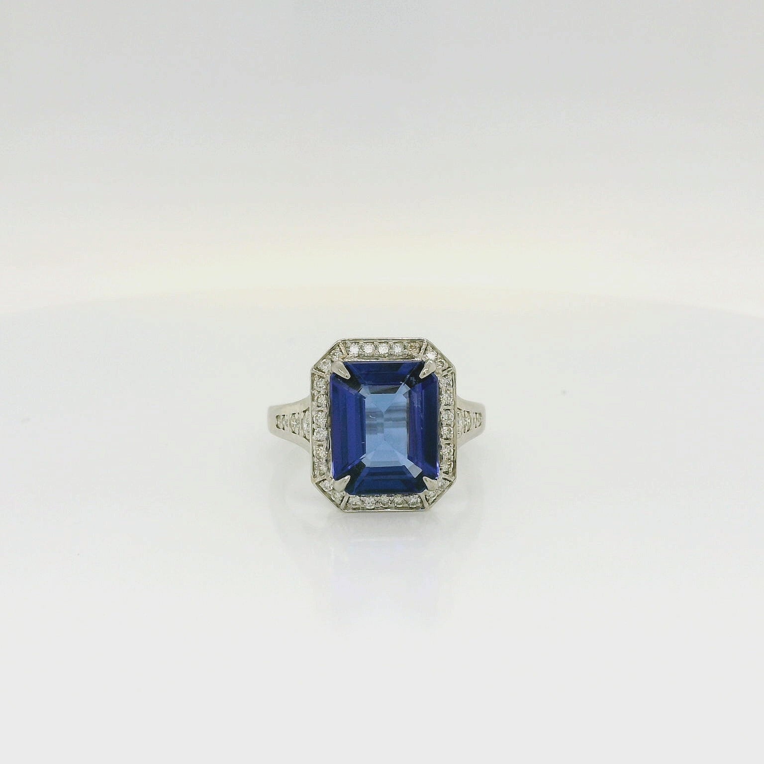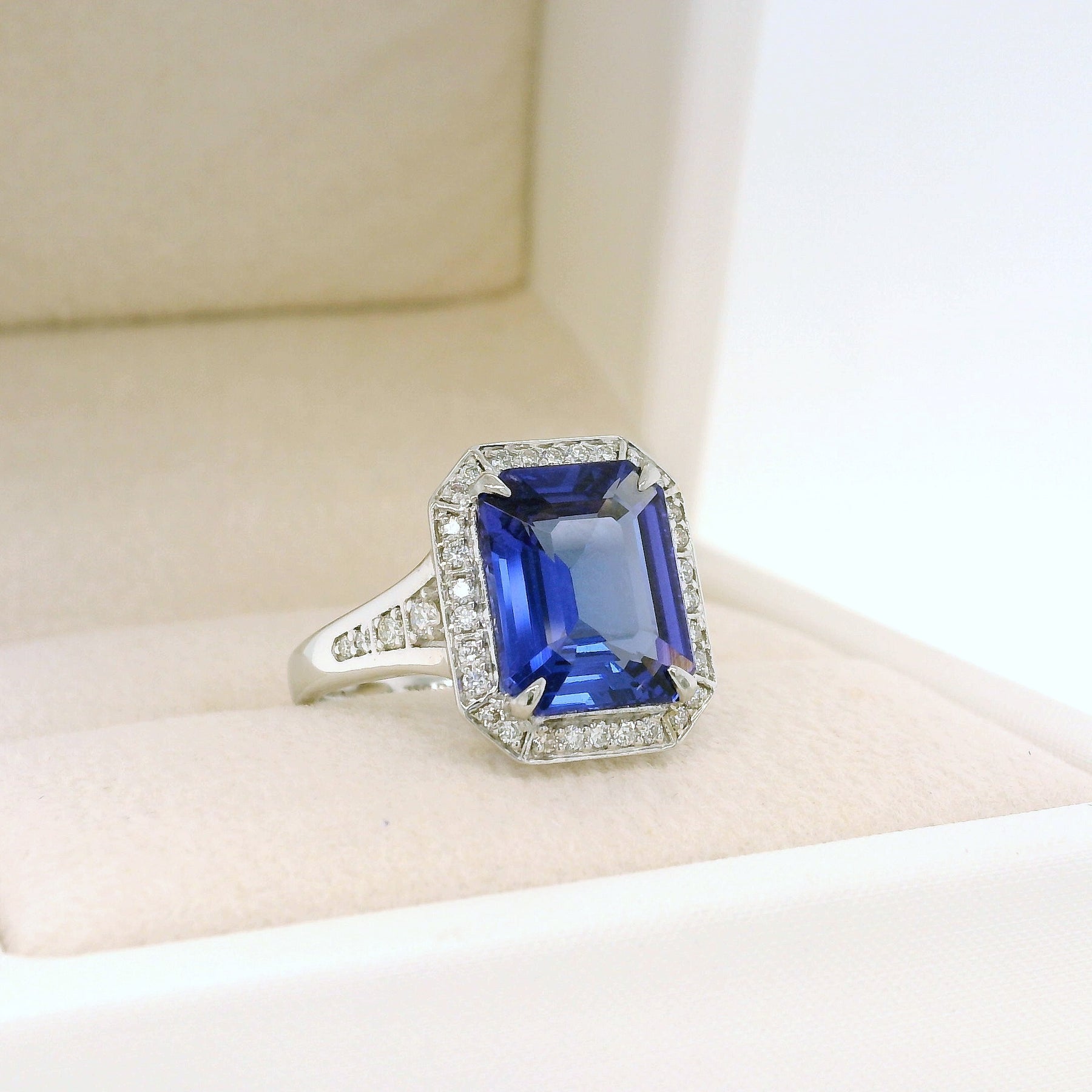 Crafted in radiant 18K white gold, this refined ring features a breathtaking 3.78ct emerald-cut tanzanite, prized for its deep blue-violet hue and elegant step-cut facets. The striking centre stone is enhanced by carefully set natural diamond accents along the band, totalling 0.30ct, adding subtle brilliance without overpowering the tanzanite’s commanding presence. Sophisticated and bold, this piece is designed for those who appreciate clean lines, rich colour, and timeless luxury.