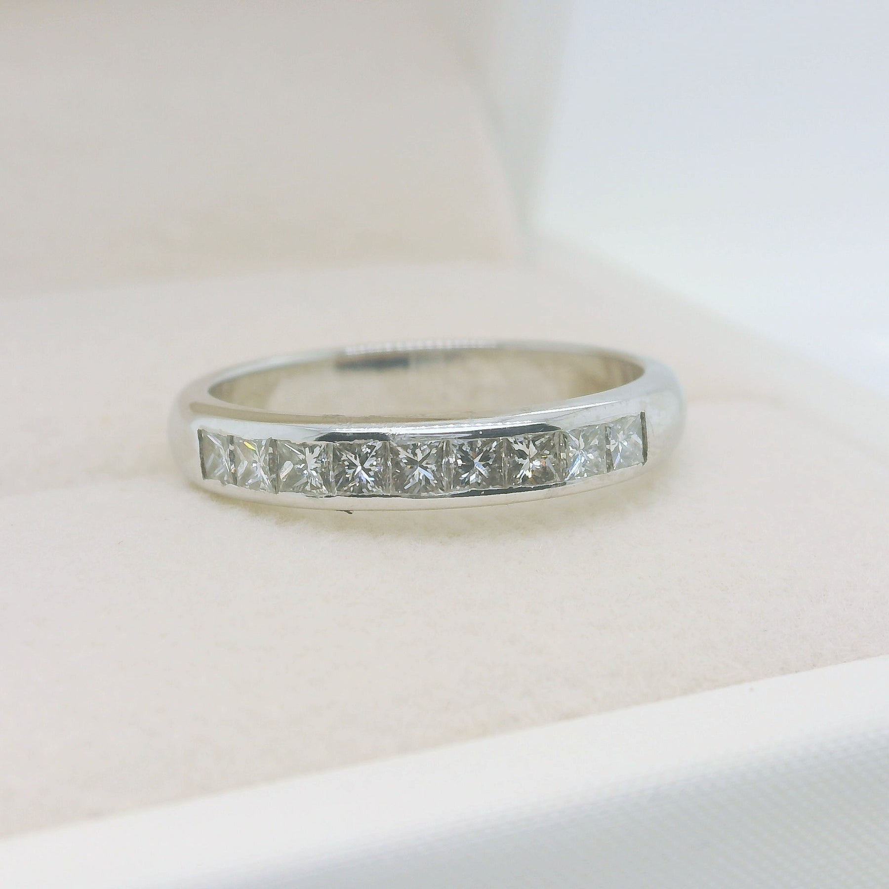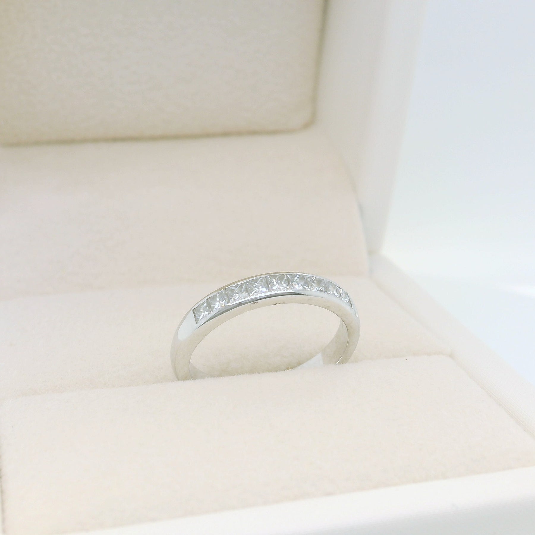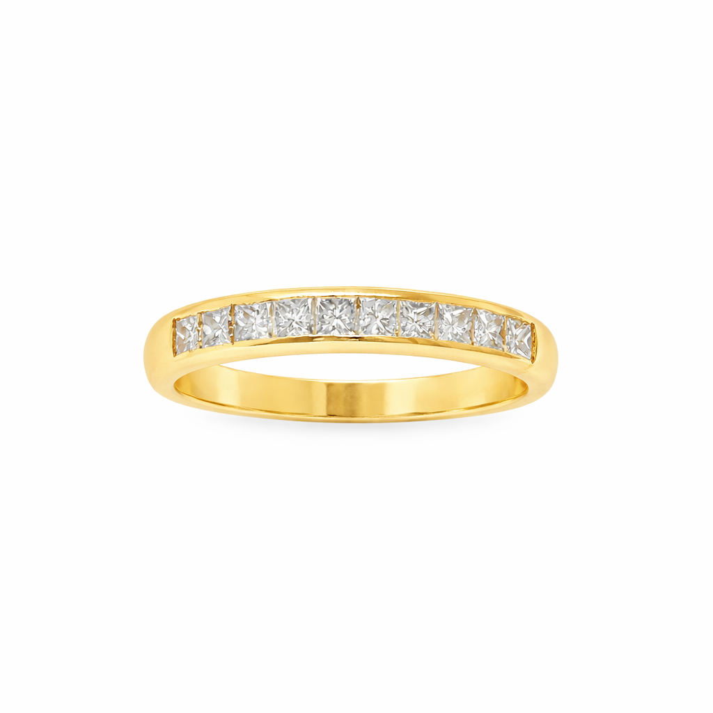 Juno features a sleek row of princess-cut diamonds set neatly within a polished channel, creating a smooth and structured band of square brilliance. The clean lines of the channel setting protect the stones while highlighting the sharp geometry of each princess cut for a modern and timeless look.