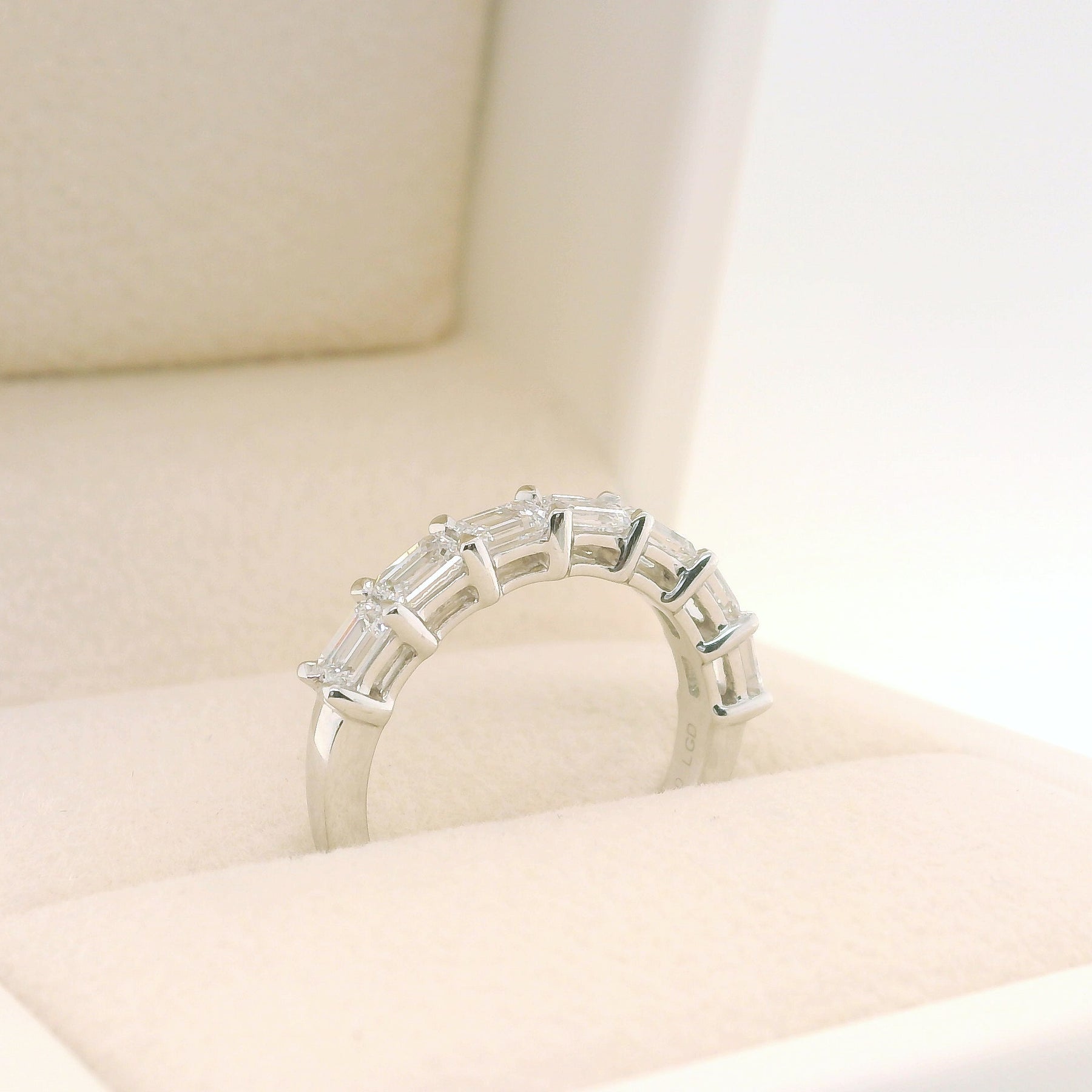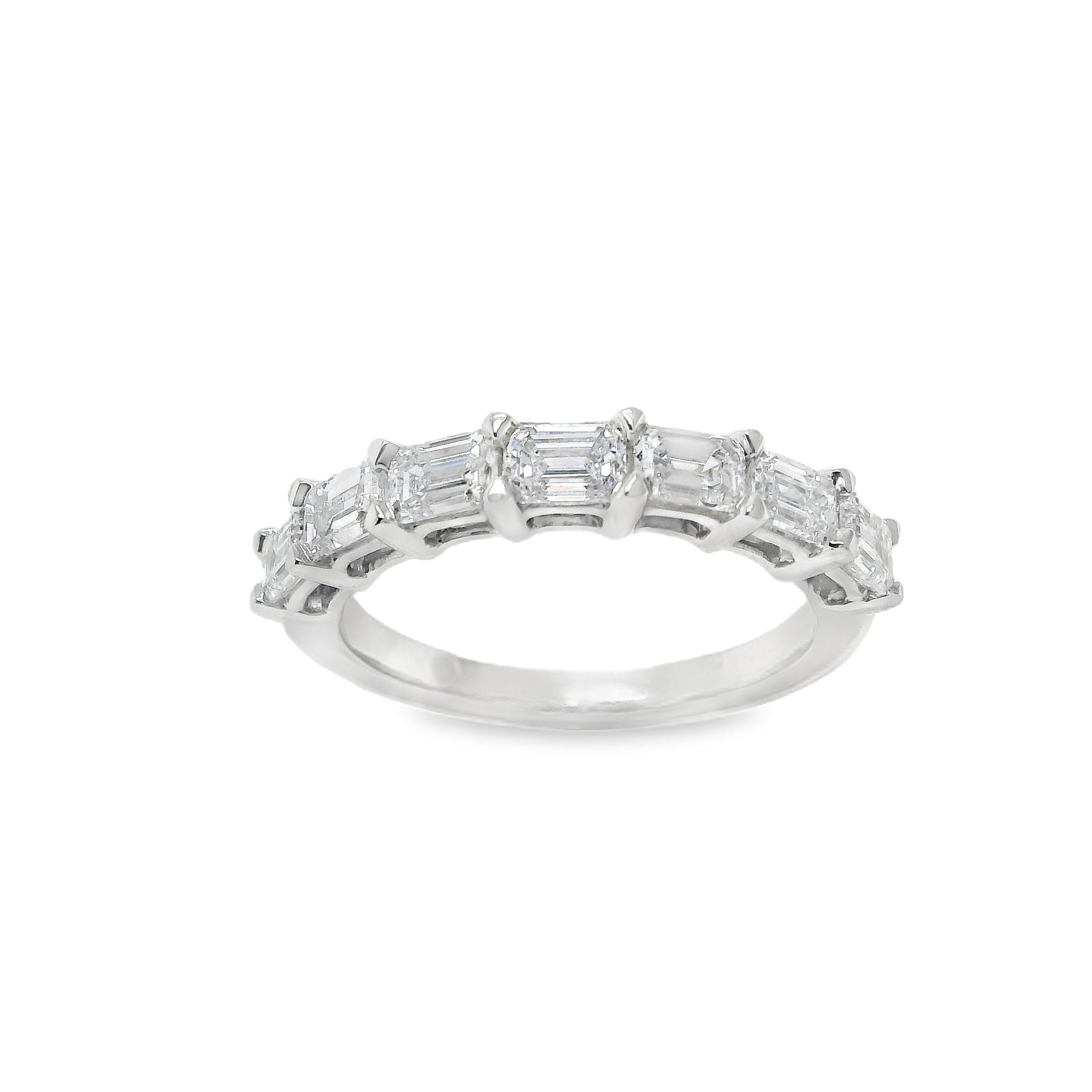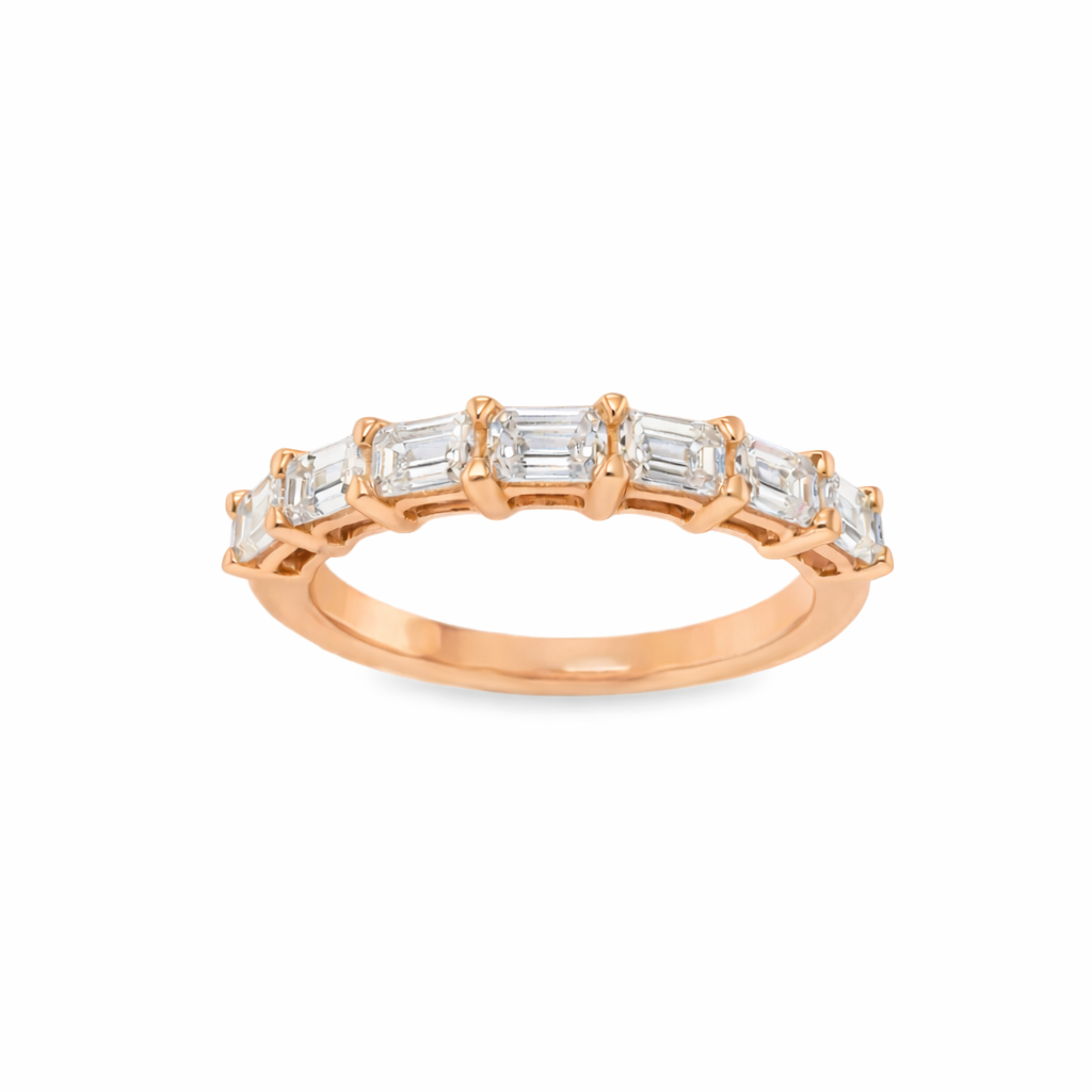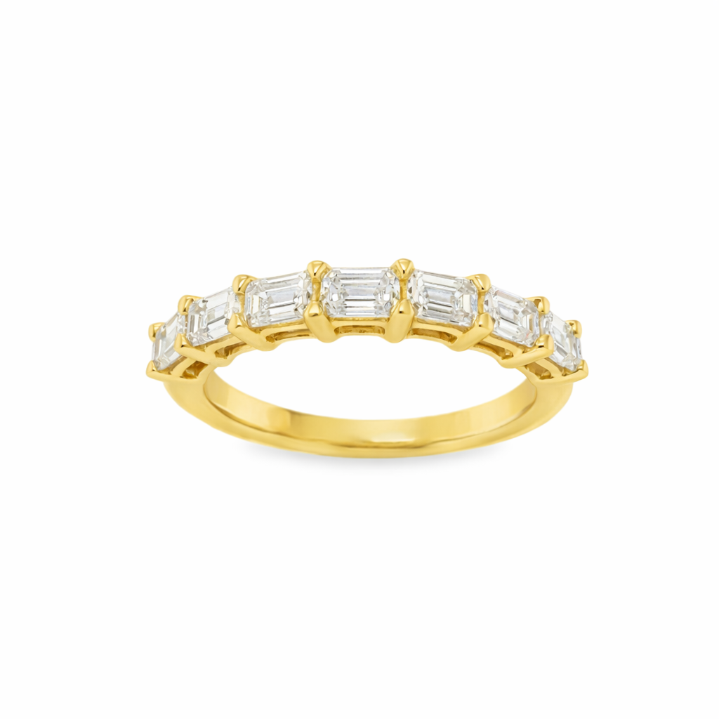 Nori delivers a bold, architectural look with emerald-cut diamonds set horizontally in refined claws. The east-west orientation highlights the clean geometry of the step-cut stones, creating a structured and contemporary diamond band.